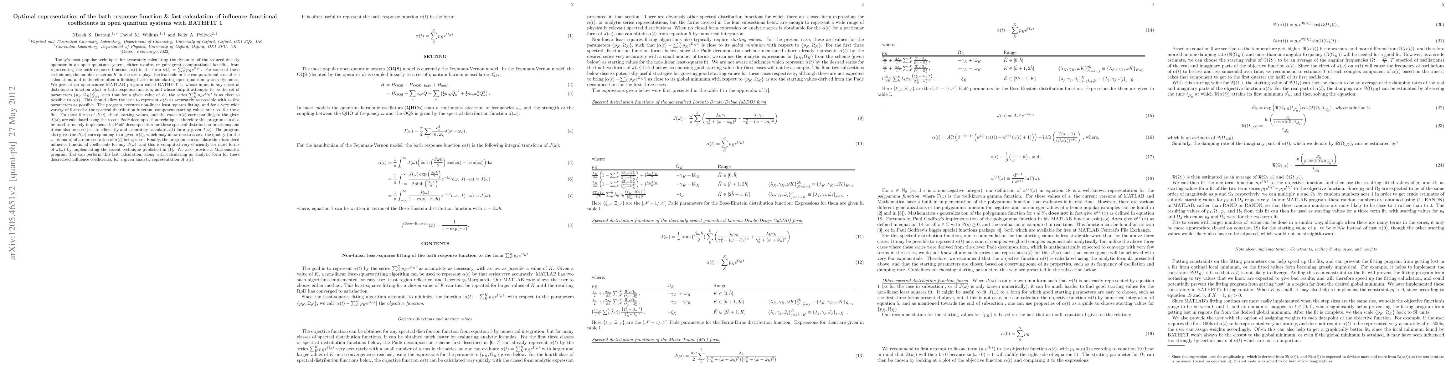 Today's most popular techniques for accurately calculating the dynamics of the reduced density operator in an open quantum system, either require, or gain great computational benefits, from representing the bath response function a(t) in the form a(t)={\Sigma}_k^K p_k e^{O_k t} . For some of these techniques, the number of terms in the series K plays the lead role in the computational cost of the calculation, and is therefore often a limiting factor in simulating open quantum system dynamics. We present an open source MATLAB program called BATHFIT 1, whose input is any spectral distribution functions J(w) or bath response function, and whose output attempts to be the set of parameters {p_k,w_k}_k=1^K such that for a given value of K, the series {\Sigma}_k^k p_k e^{O_k t} is as close as possible to a(t). This should allow the user to represent a(t) as accurately as possible with as few parameters as possible. The program executes non-linear least squares fitting, and for a very wide variety of spectral distribution functions, competent starting parameters are used for these fits. For most forms of J(w), these starting parameters, and the exact a(t) corresponding to the given J(w), are calculated using the recent Pade decomposition technique - therefore this program can also be used to merely implement the Pade decomposition for these spectral distribution functions; and it can also be used just to efficiently and accurately calculate a(t) for any given J(w) . The program also gives the J(w) corresponding to a given a(t), which may allow one to assess the quality (in the w-domain) of a representation of a(t) being used. Finally, the program can calculate the discretized influence functional coefficients for any J(w), and this is computed very efficiently for most forms of J(w) by implementing the recent technique published in [Quantum Physics Letters (2012) 1 (1) pg. 35].