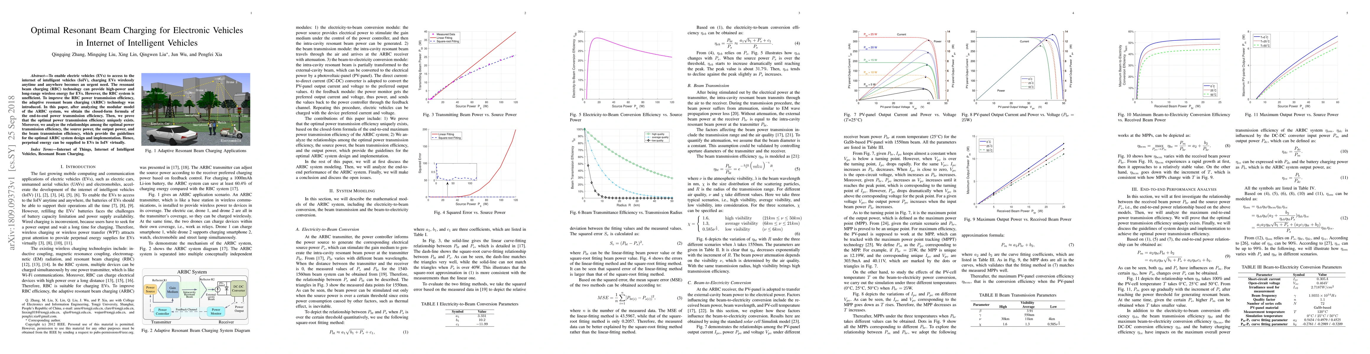 To enable electric vehicles (EVs) to access to the internet of intelligent vehicles (IoIV), charging EVs wirelessly anytime and anywhere becomes an urgent need. The resonant beam charging (RBC) technology can provide high-power and long-range wireless energy for EVs. However, the RBC system is unefficient. To improve the RBC power transmission efficiency, the adaptive resonant beam charging (ARBC) technology was introduced. In this paper, after analyzing the modular model of the ARBC system, we obtain the closed-form formula of the end-to-end power transmission efficiency. Then, we prove that the optimal power transmission efficiency uniquely exists. Moreover, we analyze the relationships among the optimal power transmission efficiency, the source power, the output power, and the beam transmission efficiency, which provide the guidelines for the optimal ARBC system design and implementation. Hence, perpetual energy can be supplied to EVs in IoIV virtually.