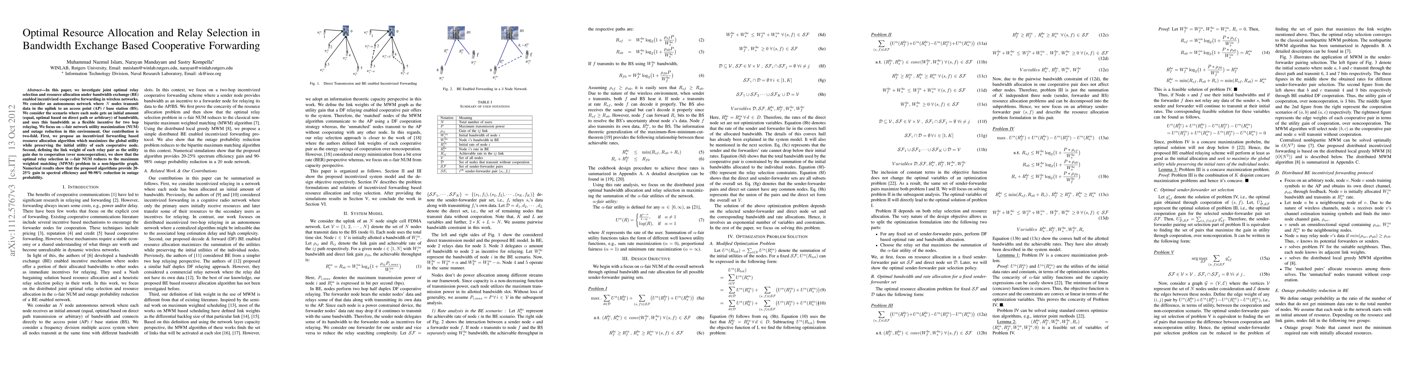 This paper proposes an optimal relay selection and resource allocation algorithm for bandwidth exchange-enabled cooperative forwarding in wireless networks. It maximizes global utility while preserving initial node utility, and demonstrates significant improvements in spectral efficiency and outage reduction.