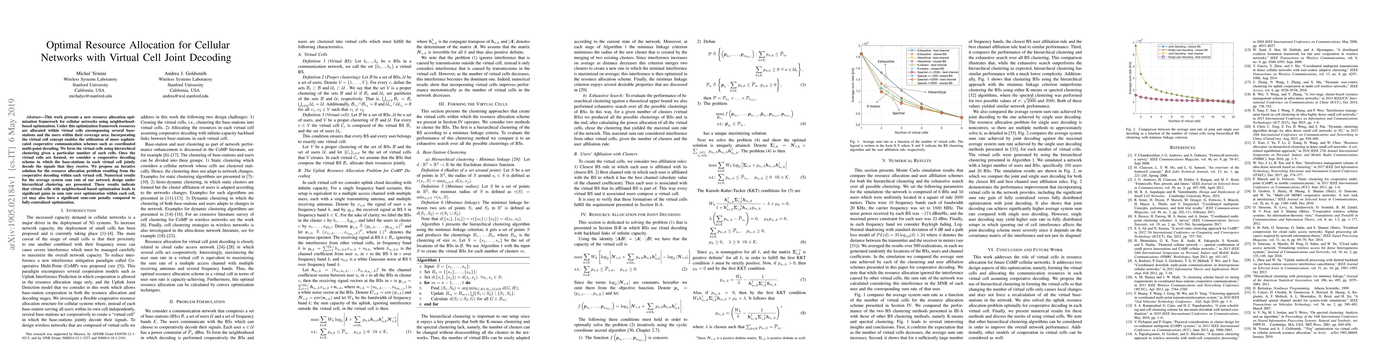 This work presents a new resource allocation optimization framework for cellular networks using neighborhood-based optimization. Under this optimization framework resources are allocated within virtual cells encompassing several base-stations and the users within their coverage area. Incorporating the virtual cell concept enables the utilization of more sophisticated cooperative communication schemes such as coordinated multi-point decoding. We form the virtual cells using hierarchical clustering given a particular number of such cells. Once the virtual cells are formed, we consider a cooperative decoding scheme in which the base-stations in each virtual cell jointly decode the signals that they receive. We propose an iterative solution for the resource allocation problem resulting from the cooperative decoding within each virtual cell. Numerical results for the average system sum rate of our network design under hierarchical clustering are presented. These results indicate that virtual cells with neighborhood-based optimization leads to significant gains in sum rate over optimization within each cell, yet may also have a significant sum-rate penalty compared to fully-centralized optimization.