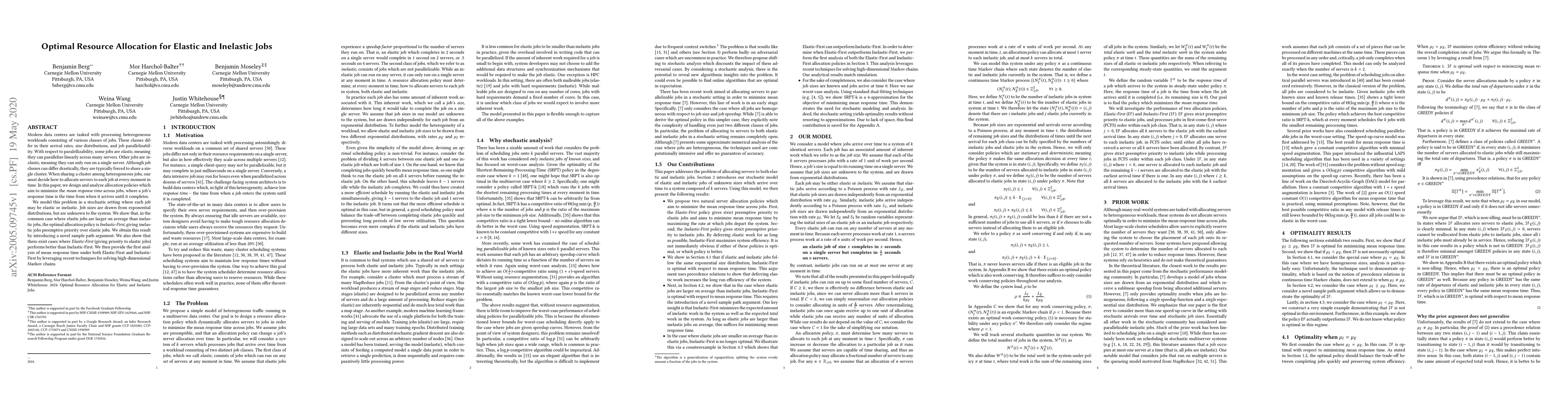 Modern data centers are tasked with processing heterogeneous workloads consisting of various classes of jobs. These classes differ in their arrival rates, size distributions, and job parallelizability. With respect to paralellizability, some jobs are elastic, meaning they can parallelize linearly across many servers. Other jobs are inelastic, meaning they can only run on a single server. Although job classes can differ drastically, they are typically forced to share a single cluster. When sharing a cluster among heterogeneous jobs, one must decide how to allocate servers to each job at every moment in time. In this paper, we design and analyze allocation policies which aim to minimize the mean response time across jobs, where a job's response time is the time from when it arrives until it completes. We model this problem in a stochastic setting where each job may be elastic or inelastic. Job sizes are drawn from exponential distributions, but are unknown to the system. We show that, in the common case where elastic jobs are larger on average than inelastic jobs, the optimal allocation policy is Inelastic-First, giving inelastic jobs preemptive priority over elastic jobs. We obtain this result by introducing a novel sample path argument. We also show that there exist cases where Elastic-First (giving priority to elastic jobs) performs better than Inelastic-First. We then provide the first analysis of mean response time under both Elastic-First and Inelastic-First by leveraging recent techniques for solving high-dimensional Markov chains.