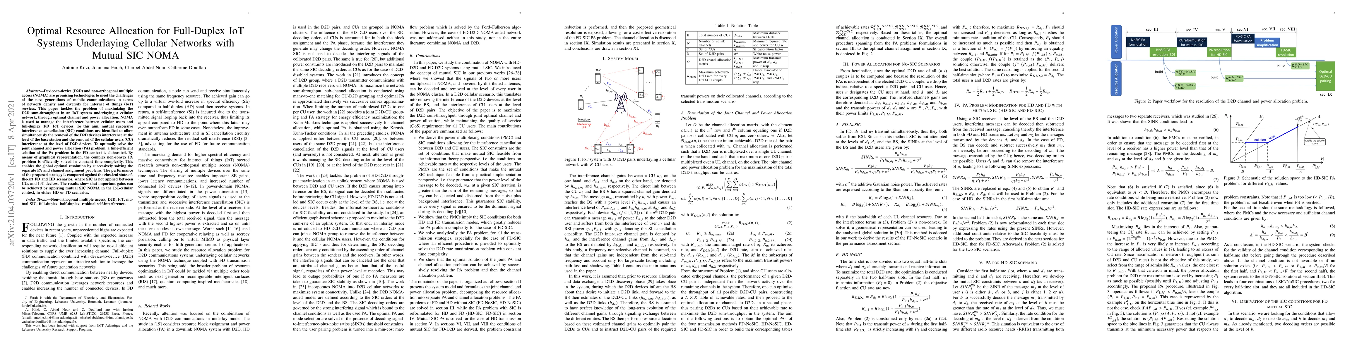 This paper proposes an optimal resource allocation strategy for full-duplex IoT systems underlaying cellular networks using NOMA and mutual SIC to maximize D2D sum-throughput. The method efficiently solves the joint channel and power allocation problem, achieving significant performance gains compared to traditional FD and HD scenarios.