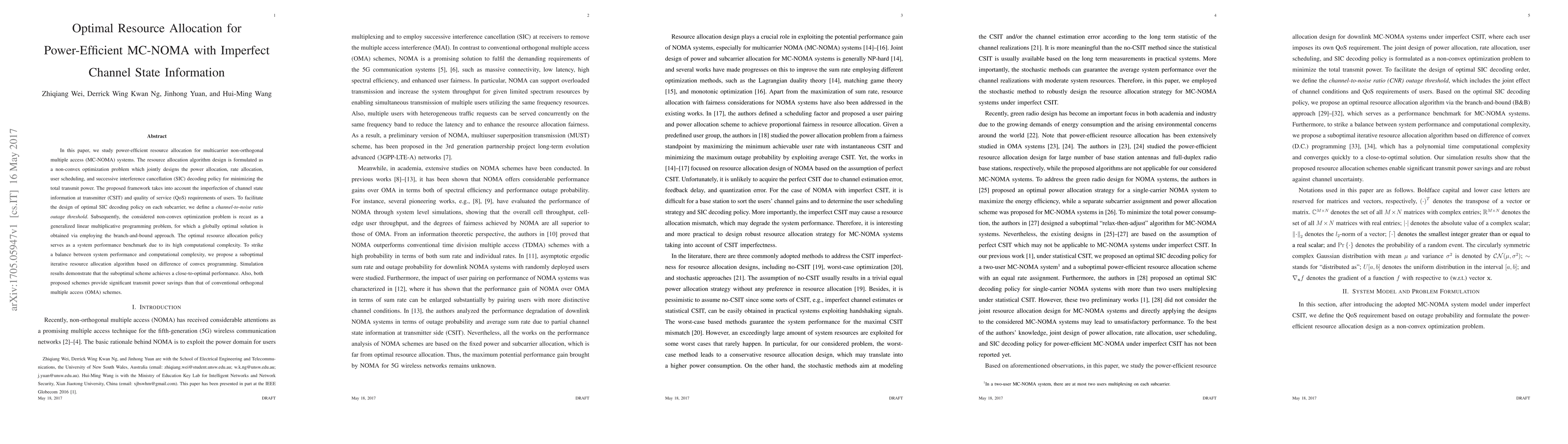 This paper proposes an optimal resource allocation algorithm for power-efficient multicarrier non-orthogonal multiple access (MC-NOMA) systems, considering imperfect channel state information. It employs a branch-and-bound approach to solve a non-convex optimization problem, achieving a globally optimal solution with significant power savings compared to conventional OMA schemes.