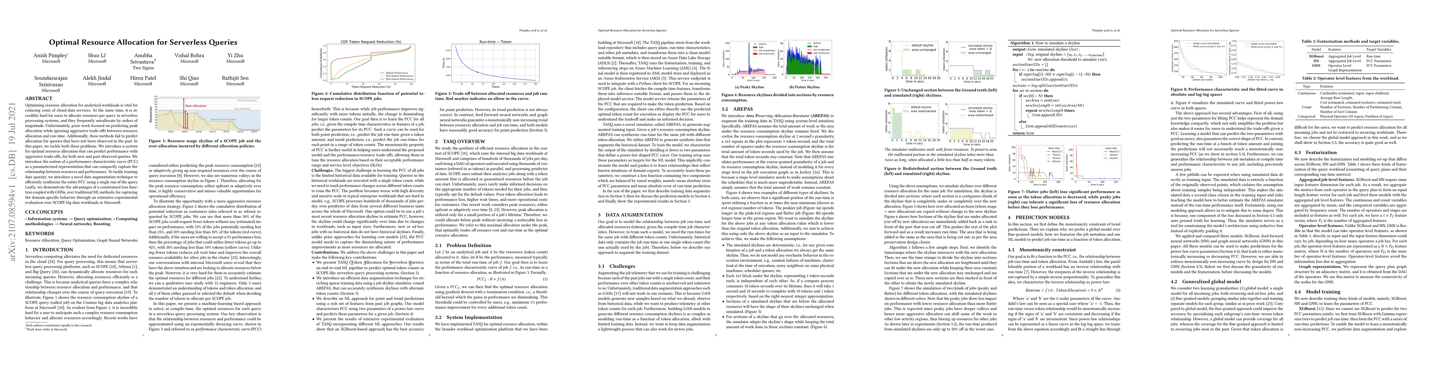 Optimizing resource allocation for analytical workloads is vital for reducing costs of cloud-data services. At the same time, it is incredibly hard for users to allocate resources per query in serverless processing systems, and they frequently misallocate by orders of magnitude. Unfortunately, prior work focused on predicting peak allocation while ignoring aggressive trade-offs between resource allocation and run-time. Additionally, these methods fail to predict allocation for queries that have not been observed in the past. In this paper, we tackle both these problems. We introduce a system for optimal resource allocation that can predict performance with aggressive trade-offs, for both new and past observed queries. We introduce the notion of a performance characteristic curve (PCC) as a parameterized representation that can compactly capture the relationship between resources and performance. To tackle training data sparsity, we introduce a novel data augmentation technique to efficiently synthesize the entire PCC using a single run of the query. Lastly, we demonstrate the advantages of a constrained loss function coupled with GNNs, over traditional ML methods, for capturing the domain specific behavior through an extensive experimental evaluation over SCOPE big data workloads at Microsoft.