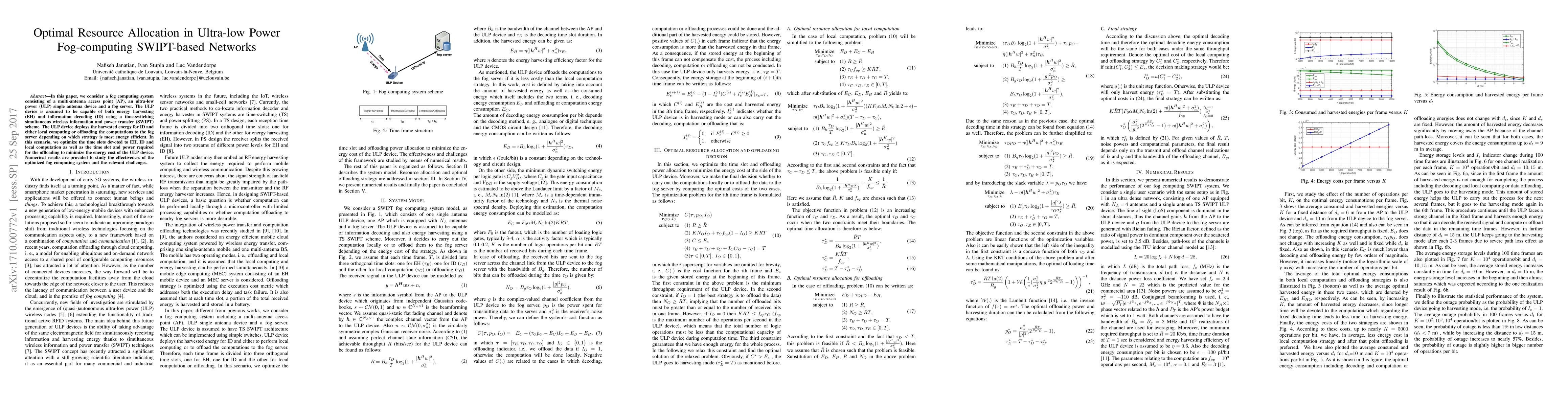 In this paper, we consider a fog computing system consisting of a multi-antenna access point (AP), an ultra-low power (ULP) single antenna device and a fog server. The ULP device is assumed to be capable of both energy harvesting (EH) and information decoding (ID) using a time-switching simultaneous wireless information and power transfer (SWIPT) scheme. The ULP device deploys the harvested energy for ID and either local computing or offloading the computations to the fog server depending on which strategy is most energy efficient. In this scenario, we optimize the time slots devoted to EH, ID and local computation as well as the time slot and power required for the offloading to minimize the energy cost of the ULP device. Numerical results are provided to study the effectiveness of the optimized fog computing system and the relevant challenges.