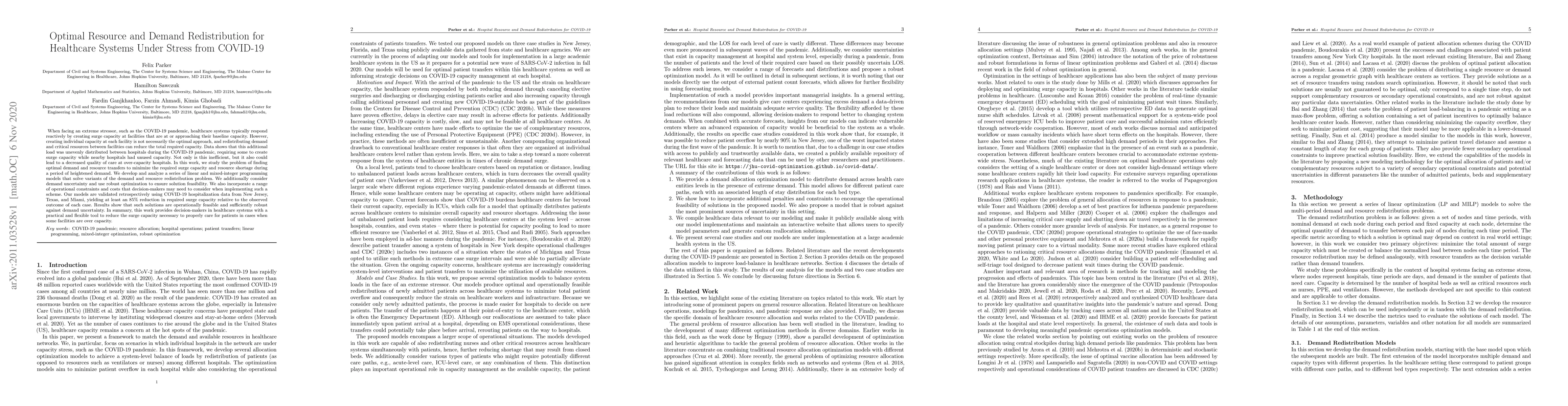 When facing an extreme stressor, such as the COVID-19 pandemic, healthcare systems typically respond reactively by creating surge capacity at facilities that are at or approaching their baseline capacity. However, creating individual capacity at each facility is not necessarily the optimal approach, and redistributing demand and critical resources between facilities can reduce the total required capacity. Data shows that this additional load was unevenly distributed between hospitals during the COVID-19 pandemic, requiring some to create surge capacity while nearby hospitals had unused capacity. Not only is this inefficient, but it also could lead to a decreased quality of care at over-capacity hospitals. In this work, we study the problem of finding optimal demand and resource transfers to minimize the required surge capacity and resource shortage during a period of heightened demand. We develop and analyze a series of linear and mixed-integer programming models that solve variants of the demand and resource redistribution problem. We additionally consider demand uncertainty and use robust optimization to ensure solution feasibility. We also incorporate a range of operational constraints and costs that decision-makers may need to consider when implementing such a scheme. Our models are validated retrospectively using COVID-19 hospitalization data from New Jersey, Texas, and Miami, yielding at least an 85% reduction in required surge capacity relative to the observed outcome of each case. Results show that such solutions are operationally feasible and sufficiently robust against demand uncertainty. In summary, this work provides decision-makers in healthcare systems with a practical and flexible tool to reduce the surge capacity necessary to properly care for patients in cases when some facilities are over capacity.