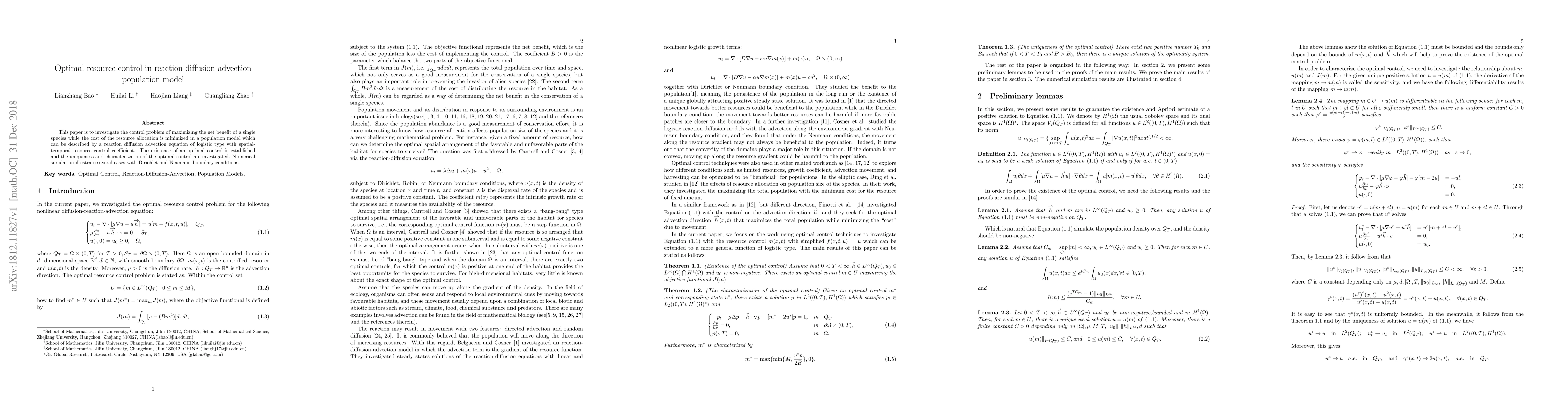 This paper is to investigate the control problem of maximizing the net benefit of a single species while the cost of the resource allocation is minimized in a population model which can be described by a reaction diffusion advection equation of logistic type with spatial-temporal resource control coefficient. The existence of an optimal control is established and the uniqueness and characterization of the optimal control are investigated. Numerical simulation illustrate several cases with Dirichlet and Neumann boundary conditions.