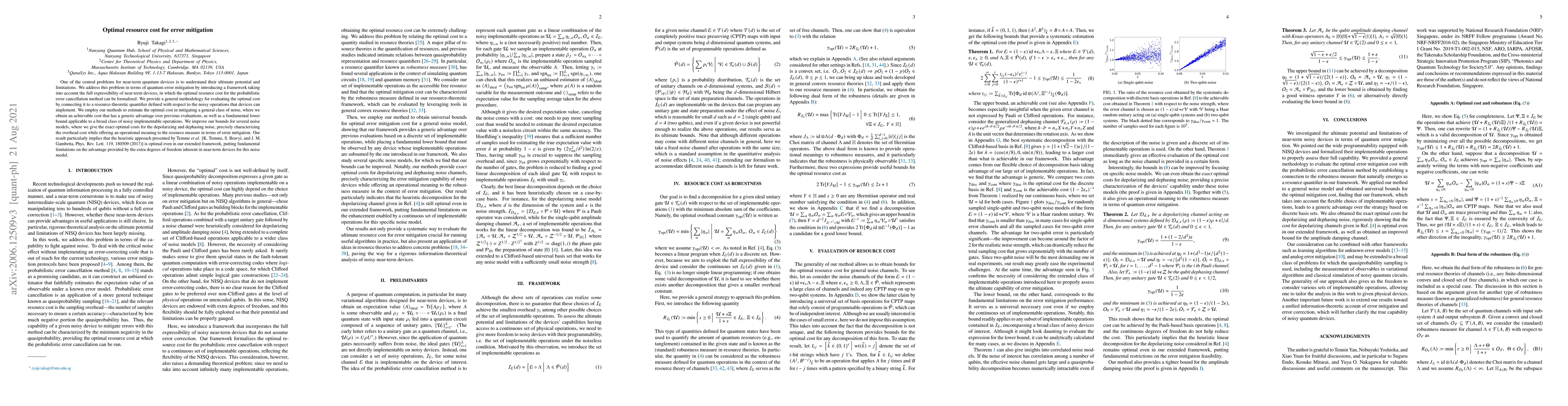 This paper introduces a framework for determining the optimal resource cost for quantum error mitigation in near-term quantum devices, providing a methodology to evaluate this cost through a resource-theoretic quantifier. The authors demonstrate improved bounds for several noise models, showing the exact optimal cost for depolarizing and dephasing noise, and confirming the optimality of the heuristic approach by Temme et al.