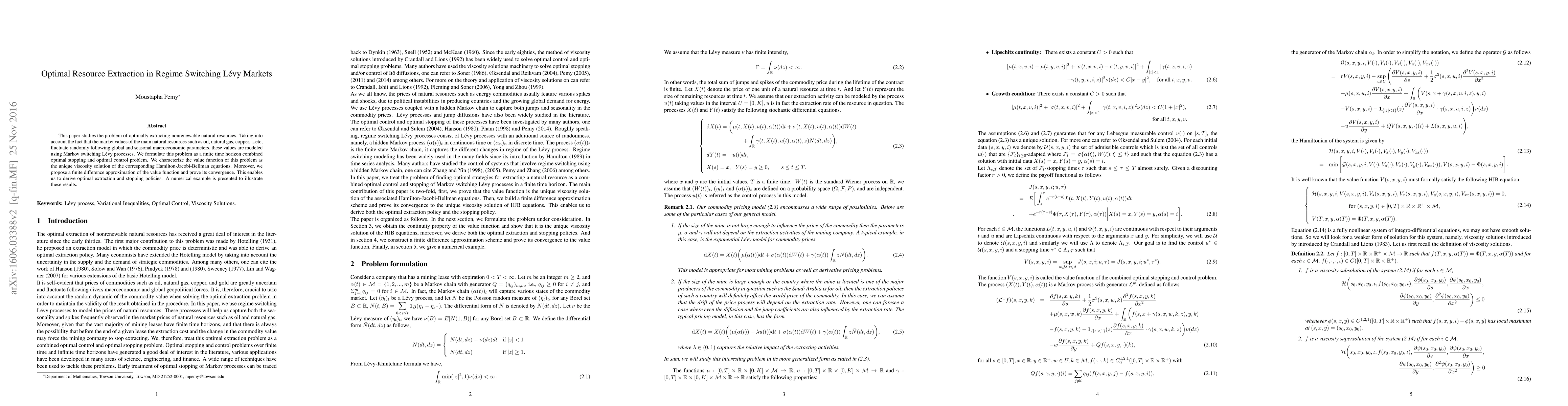 This paper investigates optimal extraction of nonrenewable resources under regime switching Lévy market dynamics, formulated as a finite-time optimal stopping and control problem. The authors prove the value function's uniqueness and convergence of its finite difference approximation, supported by numerical examples.