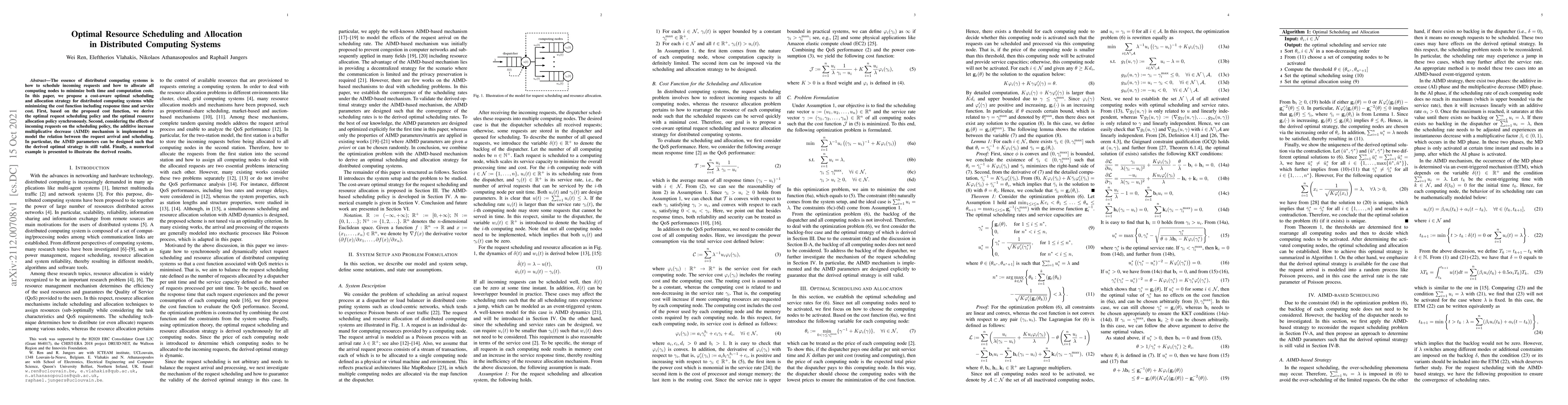 This paper proposes a cost-aware optimal scheduling and allocation strategy for distributed computing systems, aiming to minimize both time and computation costs. It derives optimal request scheduling and resource allocation policies, incorporating an AIMD mechanism to adapt to incoming requests, and demonstrates the effectiveness through a numerical example.