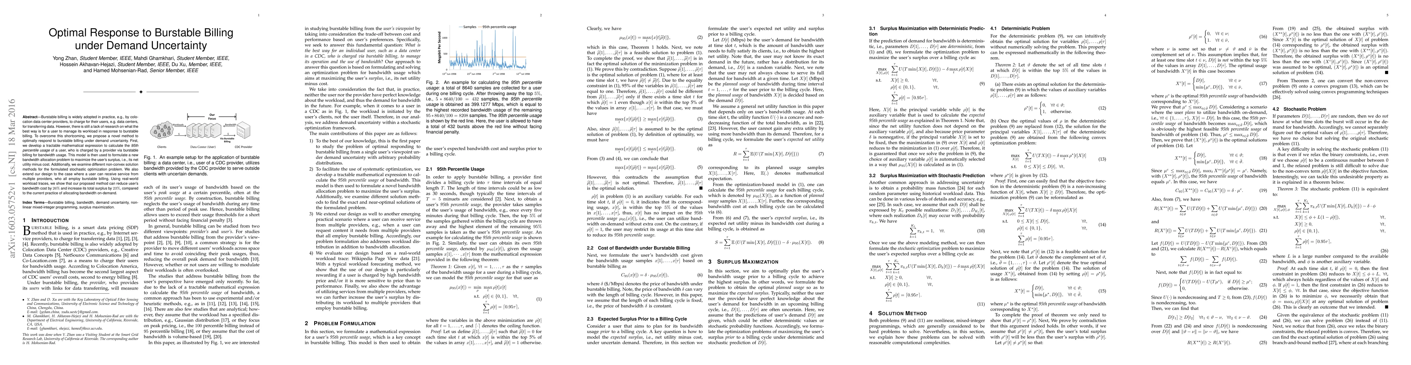 Burstable billing is widely adopted in practice, e.g., by colocation data center providers, to charge for their users, e.g., data centers, for data transferring. However, there is still a lack of research on what the best way is for a user to manage its workload in response to burstable billing. To overcome this shortcoming, we propose a novel method to optimally respond to burstable billing under demand uncertainty. First, we develop a tractable mathematical expression to calculate the 95th percentile usage of a user, who is charged by provider via burstable billing for bandwidth usage. This model is then used to formulate a new bandwidth allocation problem to maximize the user's surplus, i.e., its net utility minus cost. Additionally, we examine different non-convex solution methods for the formulated stochastic optimization problem. We also extend our design to the case where a user can receive service from multiple providers, who all employ burstable billing. Using real-world workload traces, we show that our proposed method can reduce user's bandwidth cost by 26% and increase its total surplus by 23%, compared to the current practice of allocating bandwidth on-demand.