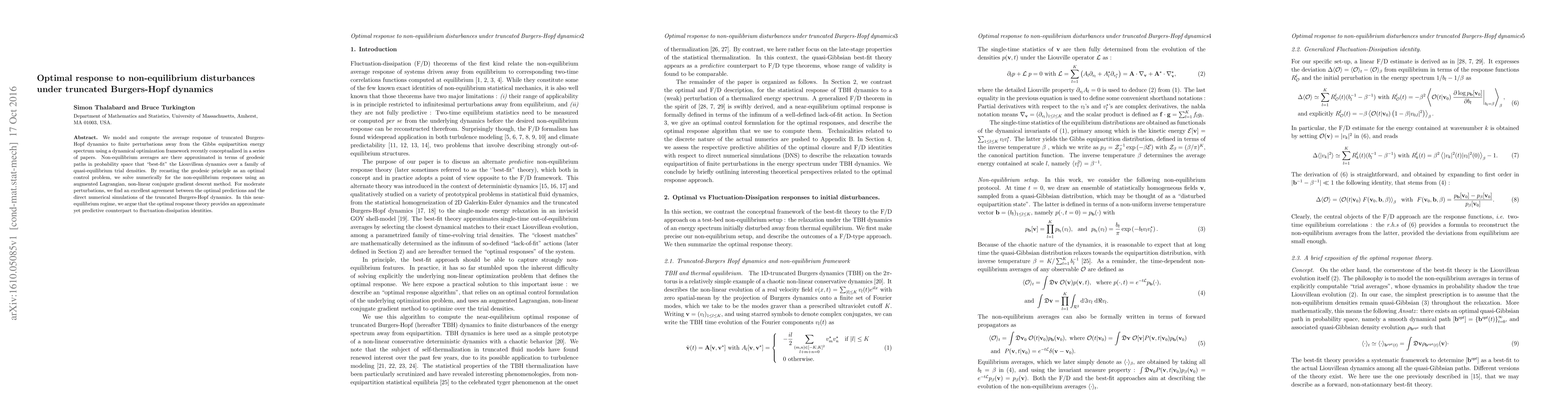 We model and compute the average response of truncated Burgers-Hopf dynamics to finite perturbations away from the Gibbs equipartition energy spectrum using a dynamical optimization framework recently conceptualized in a series of papers. Non-equilibrium averages are there approximated in terms of geodesic paths in probability space that best-fit the Liouvillean dynamics over a family of quasi-equilibrium trial densities. By recasting the geodesic principle as an optimal control problem, we solve numerically for the non-equilibrium responses using an augmented Lagrangian, non-linear conjugate gradient descent method. For moderate perturbations, we find an excellent agreement between the optimal predictions and the direct numerical simulations of the truncated Burgers-Hopf dynamics. In this near-equilibrium regime, we argue that the optimal response theory provides an approximate yet predictive counterpart to fluctuation-dissipation identities.