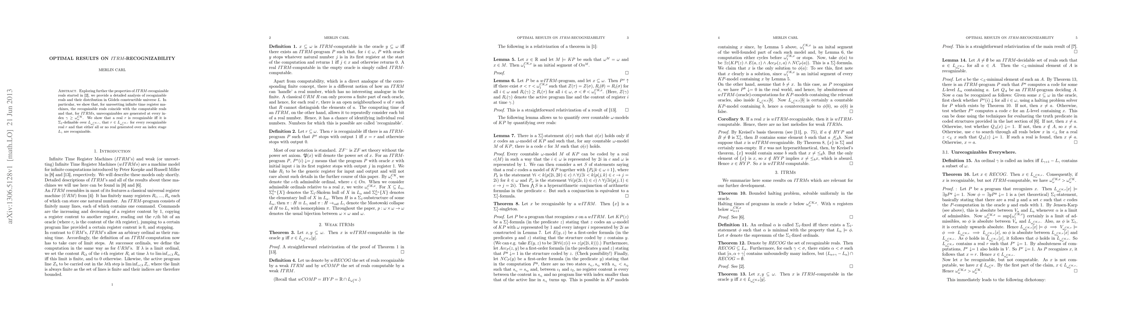 Exploring further the properties of ITRM-recognizable reals, we provide a detailed analysis of recognizable reals and their distribution in G\"odels constructible universe L. In particular, we show that, for unresetting infinite time register machines, the recognizable reals coincide with the computable reals and that, for ITRMs, unrecognizables are generated at every index bigger than the first limit of admissibles. We show that a real r is recognizable iff it is $\Sigma_{1}$-definable over $L_{\omega_{\omega}^{CK,r}}$, that $r\in L_{\omega_{\omega}^{CK,r}}$ for every recognizable real $r$ and that either all or no real generated over an index stage $L_{\gamma}$ are recognizable.