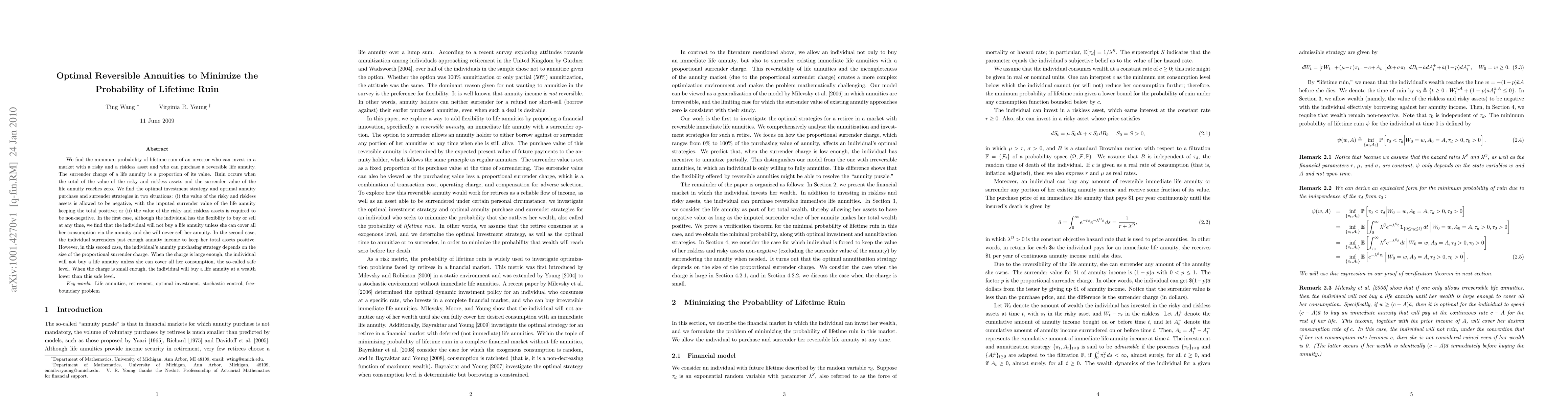 We find the minimum probability of lifetime ruin of an investor who can invest in a market with a risky and a riskless asset and who can purchase a reversible life annuity. The surrender charge of a life annuity is a proportion of its value. Ruin occurs when the total of the value of the risky and riskless assets and the surrender value of the life annuity reaches zero. We find the optimal investment strategy and optimal annuity purchase and surrender strategies in two situations: (i) the value of the risky and riskless assets is allowed to be negative, with the imputed surrender value of the life annuity keeping the total positive; or (ii) the value of the risky and riskless assets is required to be non-negative. In the first case, although the individual has the flexiblity to buy or sell at any time, we find that the individual will not buy a life annuity unless she can cover all her consumption via the annuity and she will never sell her annuity. In the second case, the individual surrenders just enough annuity income to keep her total assets positive. However, in this second case, the individual's annuity purchasing strategy depends on the size of the proportional surrender charge. When the charge is large enough, the individual will not buy a life annuity unless she can cover all her consumption, the so-called safe level. When the charge is small enough, the individual will buy a life annuity at a wealth lower than this safe level.