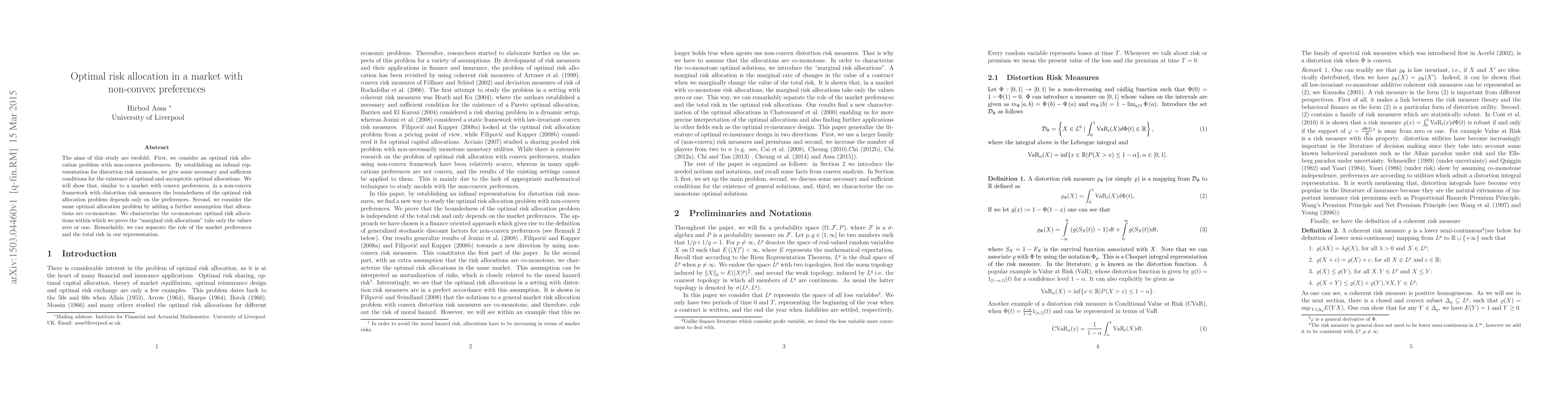 This paper explores optimal risk allocation in markets with non-convex preferences, establishing conditions for the existence of optimal and asymptotic allocations. It also characterizes co-monotone optimal allocations, proving that marginal risk allocations are binary, and separates the influence of market preferences from total risk.