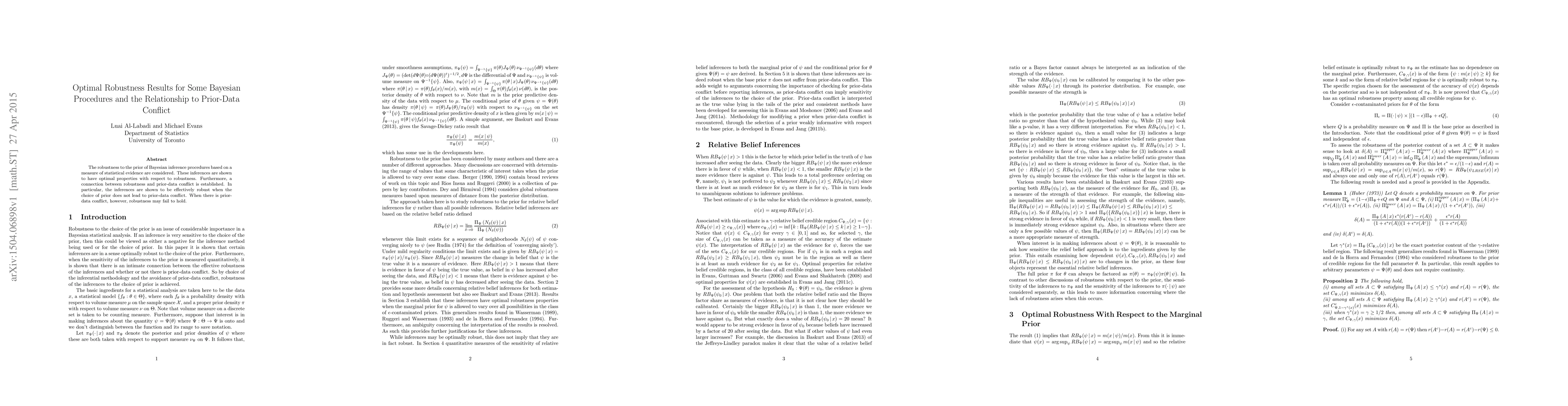 This paper investigates the robustness of Bayesian inference procedures based on statistical evidence, demonstrating their optimal robustness properties. It also establishes a link between robustness and prior-data conflict, showing that robustness holds when there is no conflict, but may fail in its presence.