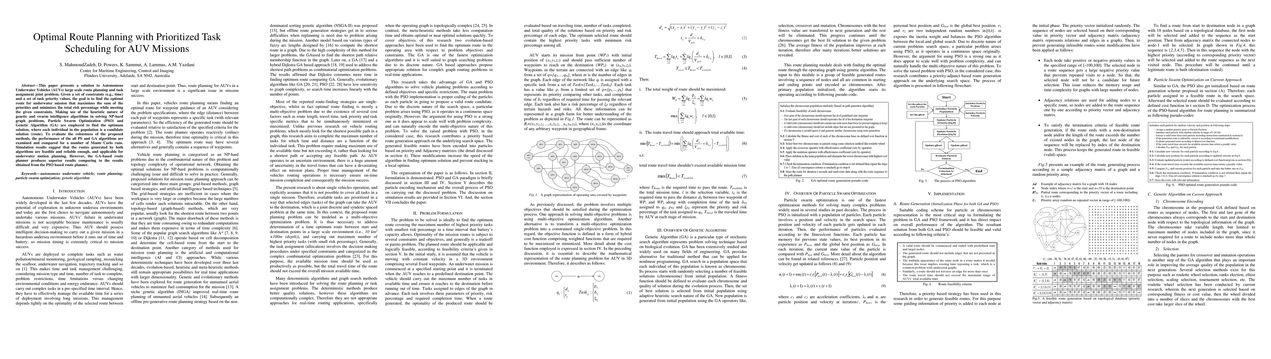 This paper proposes a method using Genetic Algorithm (GA) and Particle Swarm Optimization (PSO) to solve the complex problem of route planning and task scheduling for Autonomous Underwater Vehicles (AUVs). The GA-based approach outperforms PSO in generating optimal routes that maximize task priorities while minimizing risk, validated through extensive simulations.