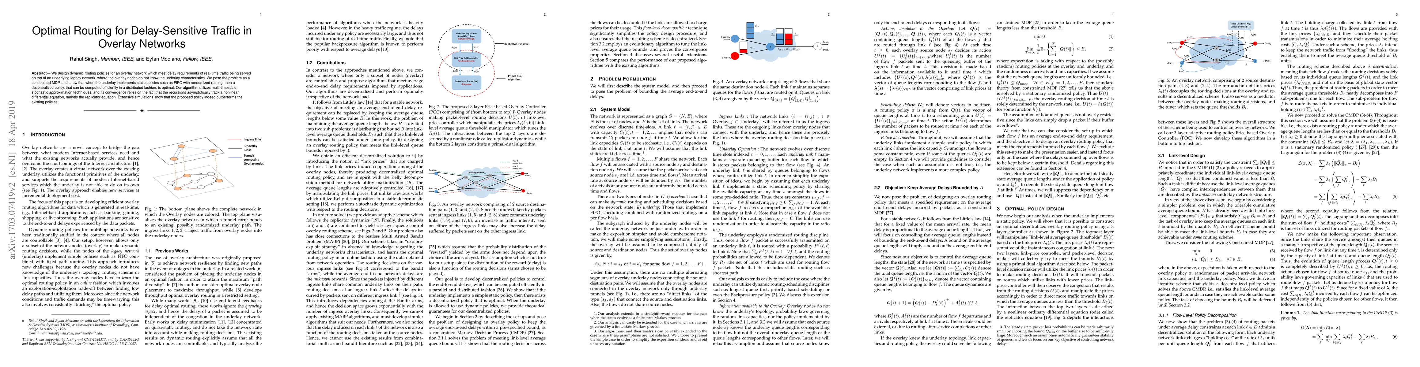 This paper proposes dynamic routing policies for overlay networks to meet the delay requirements of real-time traffic, modeled as a constrained MDP. It demonstrates that a decentralized policy, computed efficiently in a distributed manner, is optimal when the underlying network uses static policies like FIFO with randomized routing, leveraging multi-timescale stochastic approximation techniques.