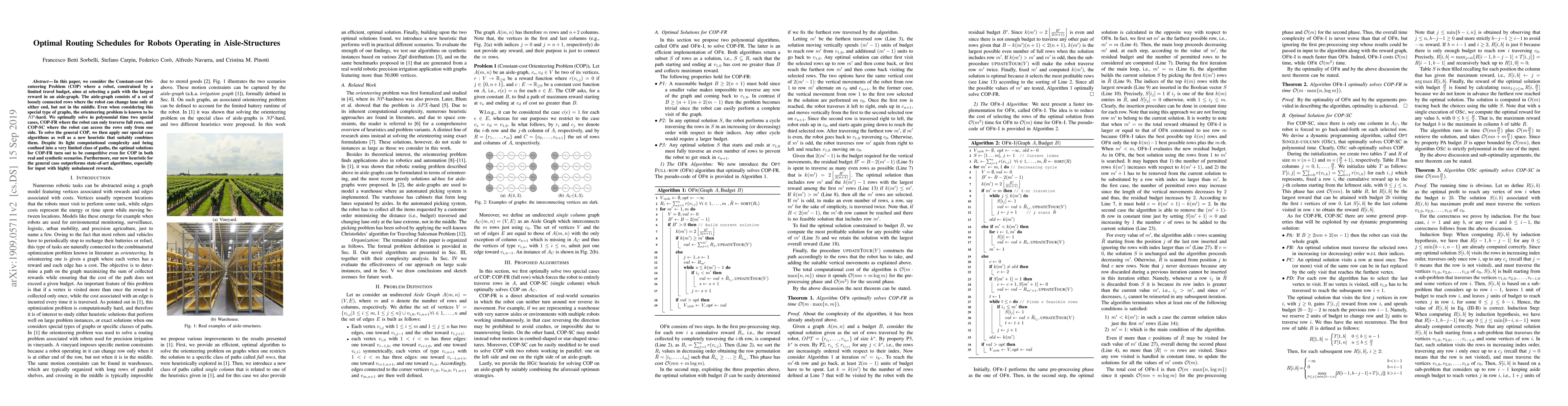 In this paper, we consider the Constant-cost Orienteering Problem (COP) where a robot, constrained by a limited travel budget, aims at selecting a path with the largest reward in an aisle-graph. The aisle-graph consists of a set of loosely connected rows where the robot can change lane only at either end, but not in the middle. Even when considering this special type of graphs, the orienteering problem is known to be NP-hard. We optimally solve in polynomial time two special cases, COP-FR where the robot can only traverse full rows, and COP-SC where the robot can access the rows only from one side. To solve the general COP, we then apply our special case algorithms as well as a new heuristic that suitably combines them. Despite its light computational complexity and being confined into a very limited class of paths, the optimal solutions for COP-FR turn out to be competitive even for COP in both real and synthetic scenarios. Furthermore, our new heuristic for the general case outperforms state-of-art algorithms, especially for input with highly unbalanced rewards.