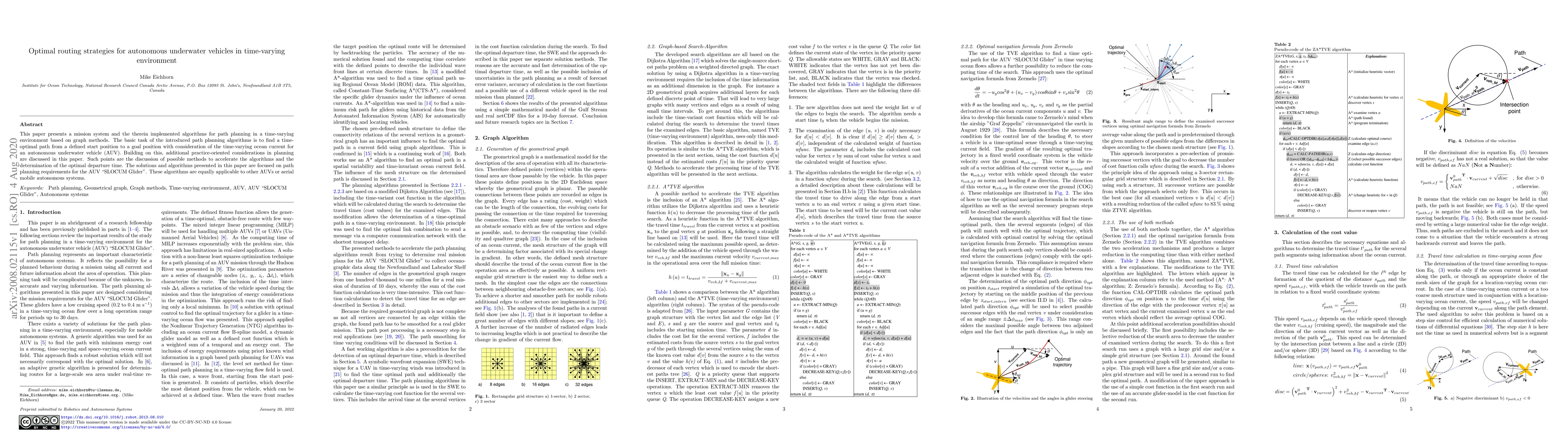 This paper develops optimal routing strategies for autonomous underwater vehicles (AUVs) navigating time-varying ocean currents, utilizing graph-based algorithms for time-optimal path planning. It also explores methods to accelerate algorithms and determine the best departure times, with a focus on the AUV "SLOCUM Glider."