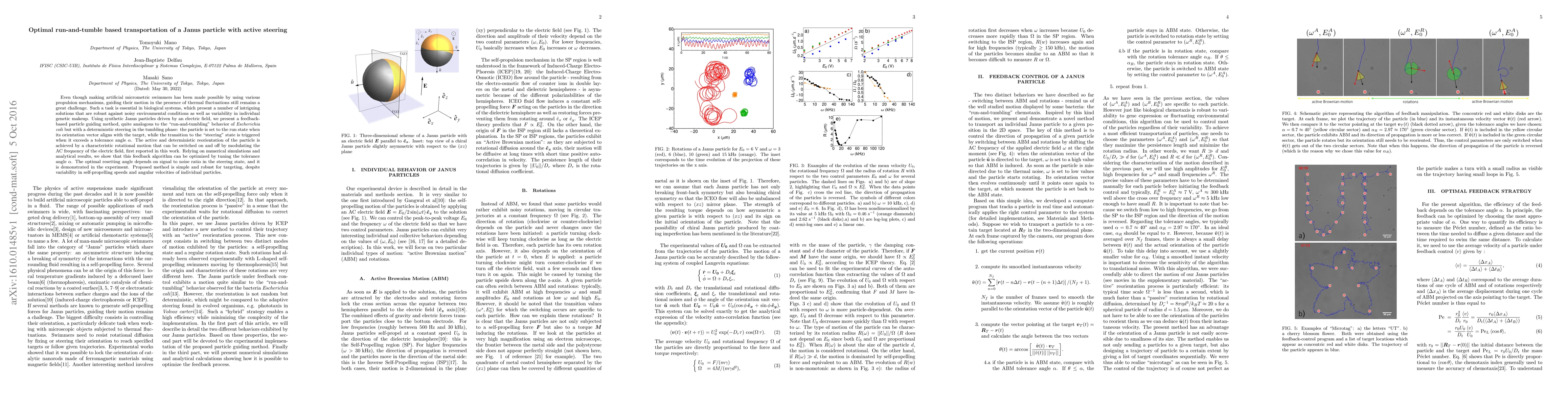 This research introduces a method to guide synthetic Janus particles using an electric field, inspired by bacterial 'run-and-tumble' behavior. The particles' orientation determines their 'run' or 'steering' state, with steering achieved via modulated electric field frequency. The method is optimized by tuning a tolerance angle, proven effective across varying self-propelling speeds and angular velocities.