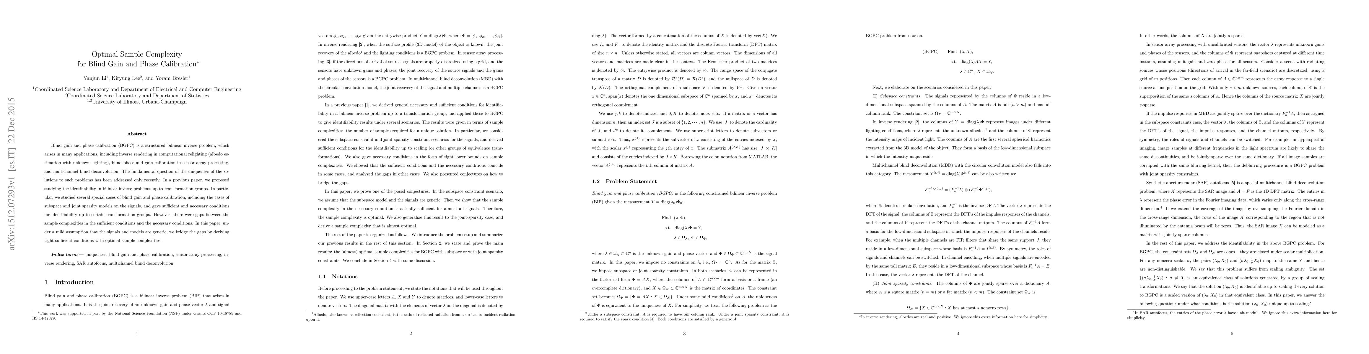 This paper addresses the optimal sample complexity for blind gain and phase calibration (BGPC), a structured bilinear inverse problem prevalent in applications like computational relighting and sensor array processing. It bridges gaps in previous research by deriving tight sufficient conditions with optimal sample complexities under generic signal and model assumptions.