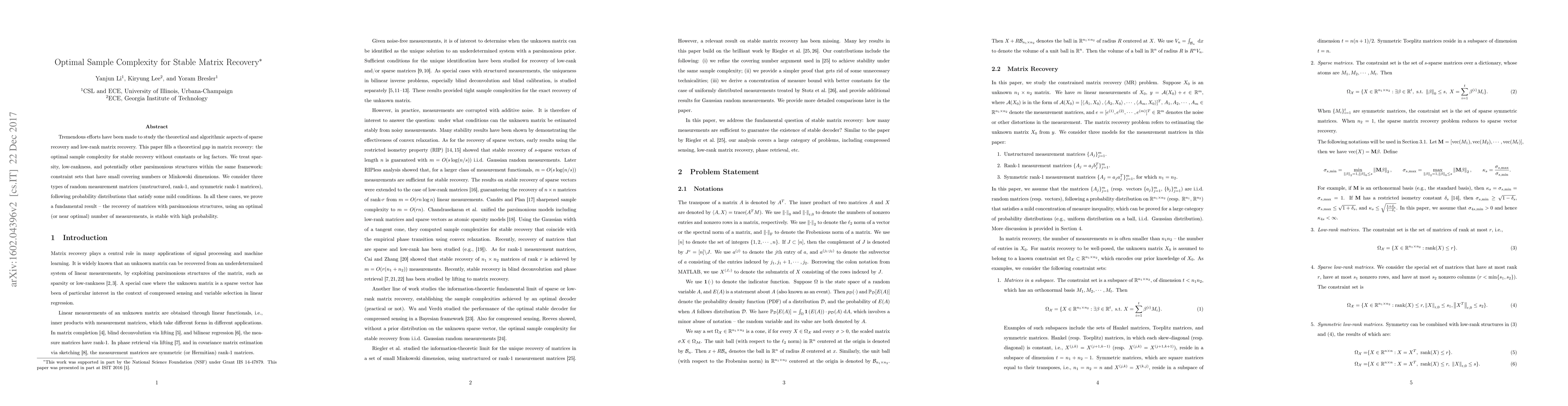 This paper investigates the optimal sample complexity for stable recovery of matrices with sparse or low-rank structures, proving that an optimal (or near optimal) number of measurements can achieve stable recovery with high probability, without constants or log factors, under various random measurement matrices.
