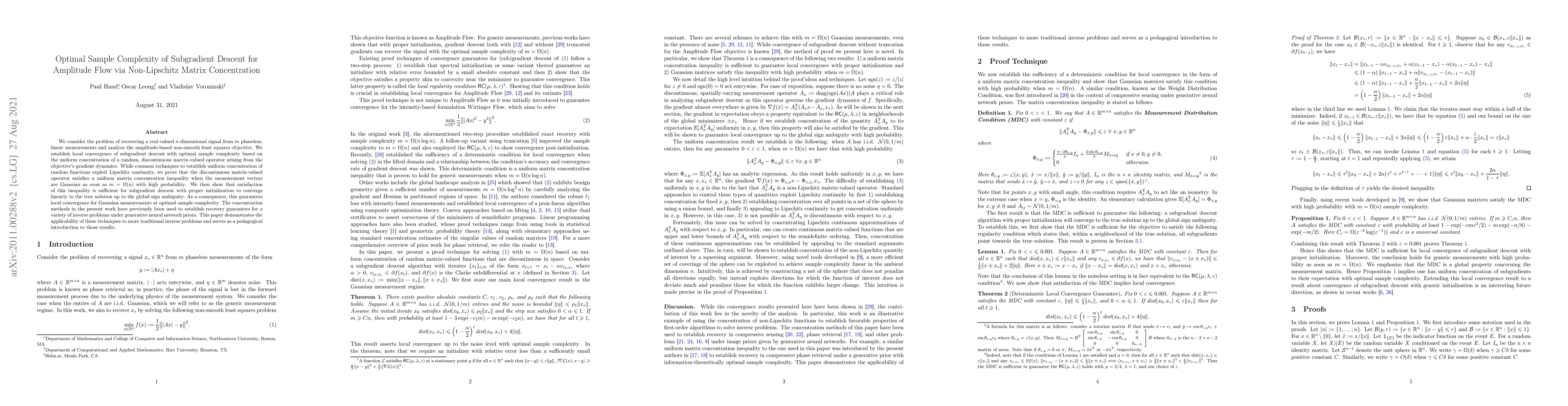 Researchers establish optimal sample complexity for subgradient descent to recover a real-valued signal from phaseless measurements, using Gaussian measurement vectors with high probability. This breakthrough demonstrates the applicability of concentration methods to traditional inverse problems.