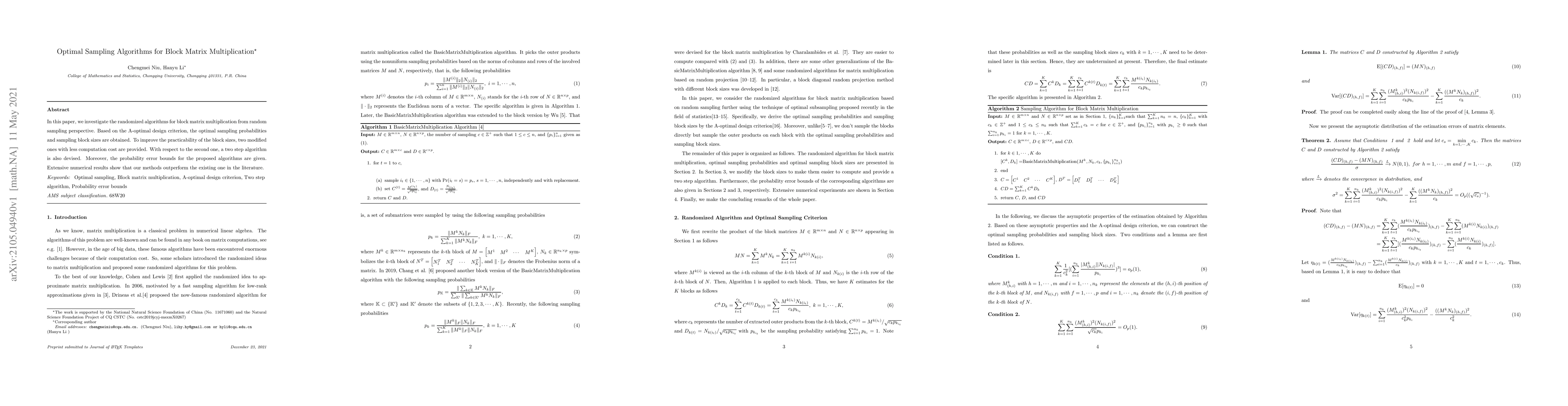 This paper develops randomized algorithms for block matrix multiplication using optimal sampling based on the A-optimal design criterion. It proposes modified sampling block sizes with reduced computational costs and a two-step algorithm, along with error bounds, demonstrating superior performance over existing methods.