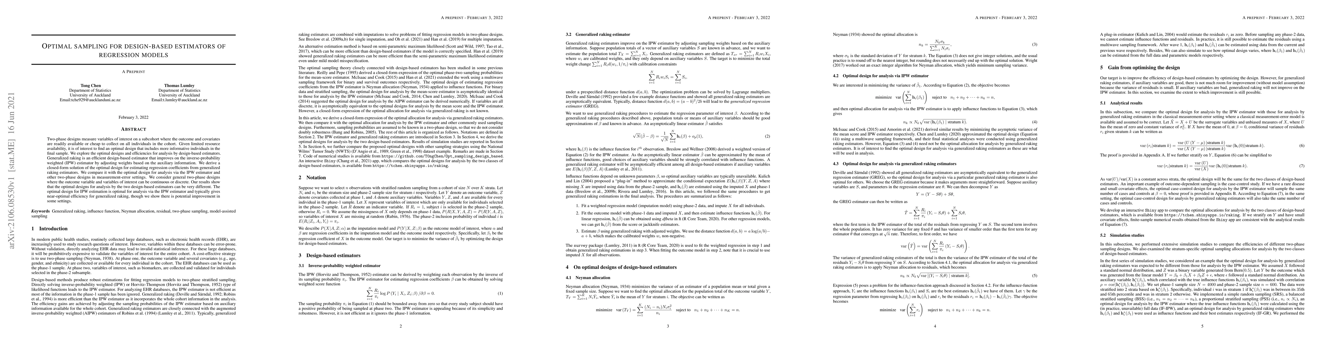 Researchers explored optimal design-based sampling methods for regression models to improve efficiency in analysis with limited resources. They found that the optimal designs can vary between estimators, with some approaches offering near-optimal efficiency.