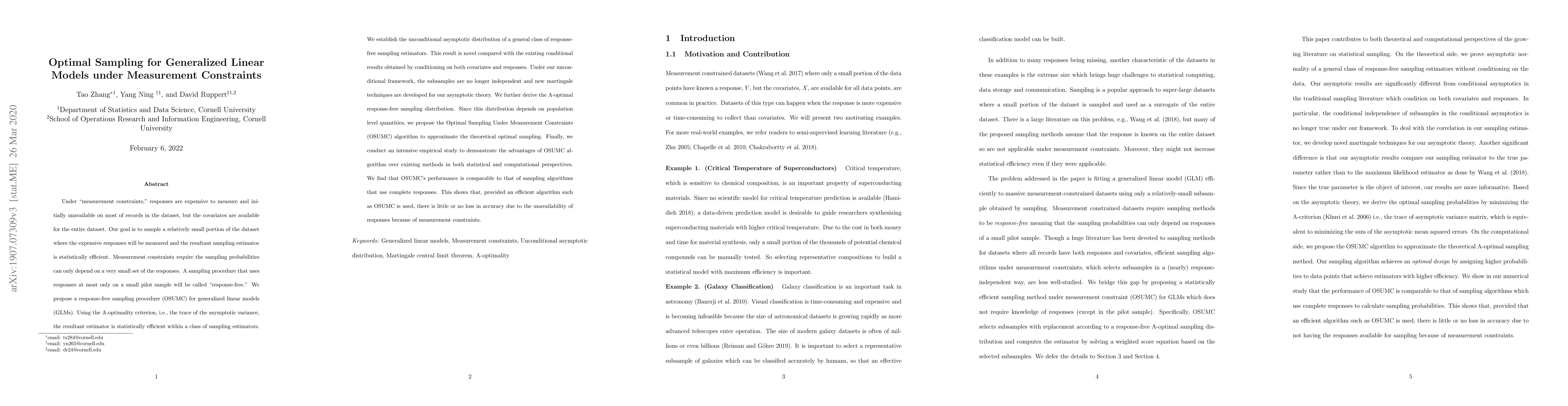 This paper proposes a response-free sampling procedure called OSUMC for generalized linear models under measurement constraints, where expensive responses are initially unavailable. The OSUMC algorithm uses A-optimality to achieve statistically efficient sampling estimators, establishing an unconditional asymptotic distribution. An empirical study demonstrates OSUMC's advantages over existing methods.