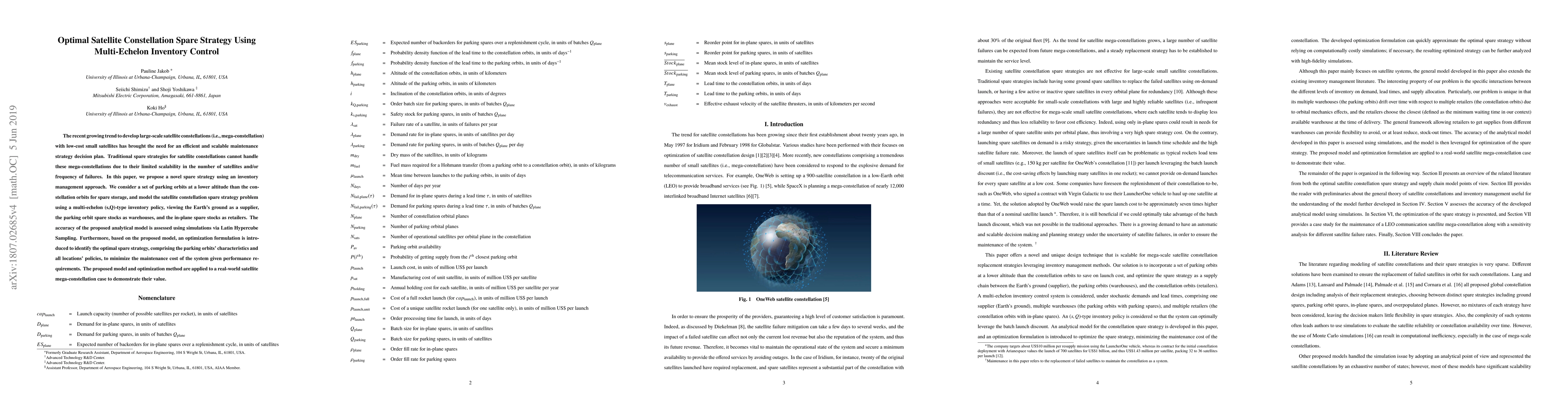 The recent growing trend to develop large-scale satellite constellations (i.e., mega-constellation) with low-cost small satellites has brought the need for an efficient and scalable maintenance strategy decision plan. Traditional spare strategies for satellite constellations cannot handle these mega-constellations due to their limited scalability in number of satellites and/or frequency of failures. In this paper, we propose a novel spare strategy using an inventory management approach. We consider a set of parking orbits at a lower altitude than the constellation for spare storage, and model satellite constellation spare strategy problem using a multi-echelon (s,Q)-type inventory policy, viewing Earth's ground as a supplier, parking orbits as warehouses, and in-plane spare stocks as retailers. This inventory model is unique in that the parking orbits (warehouses) drift away from the orbital planes over time due to orbital mechanics' effects, and the in-plane spare stocks (retailers) would receive the resupply from the closest (i.e., minimum waiting time) available warehouse at the time of delivery. The parking orbits (warehouses) are also resupplied from the ground (supplier) with stochastic lead time caused by the order processing and launch opportunities, leveraging the cost saving effects by launching many satellites in one rocket (i.e., batch launch discount). The proposed analytical model is validated against simulations using Latin Hypercube Sampling. Furthermore, based on the proposed model, an optimization formulation is introduced to identify the optimal spare strategy, comprising the parking orbits characteristics and all locations policies, to minimize the maintenance cost of the system given performance requirements. The proposed model and optimization method are applied to a real-world case study of satellite mega-constellation to demonstrate their value.
