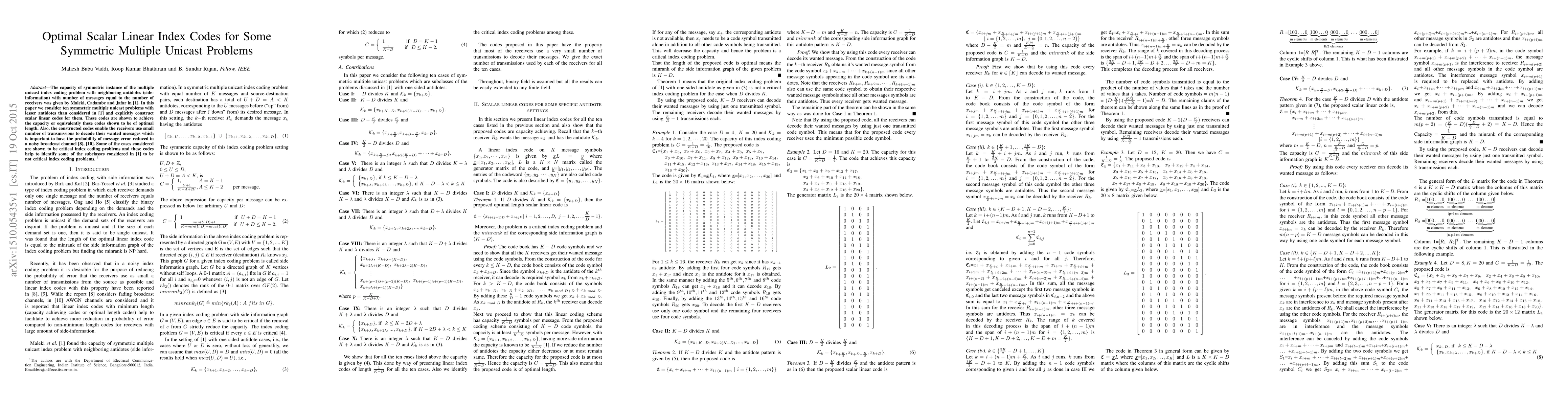 This paper constructs optimal scalar linear index codes for ten symmetric multiple unicast problems with fewer antidotes than previously studied. The proposed codes achieve optimal length and enable receivers to decode messages with minimal transmissions, reducing error probability in noisy broadcast channels.