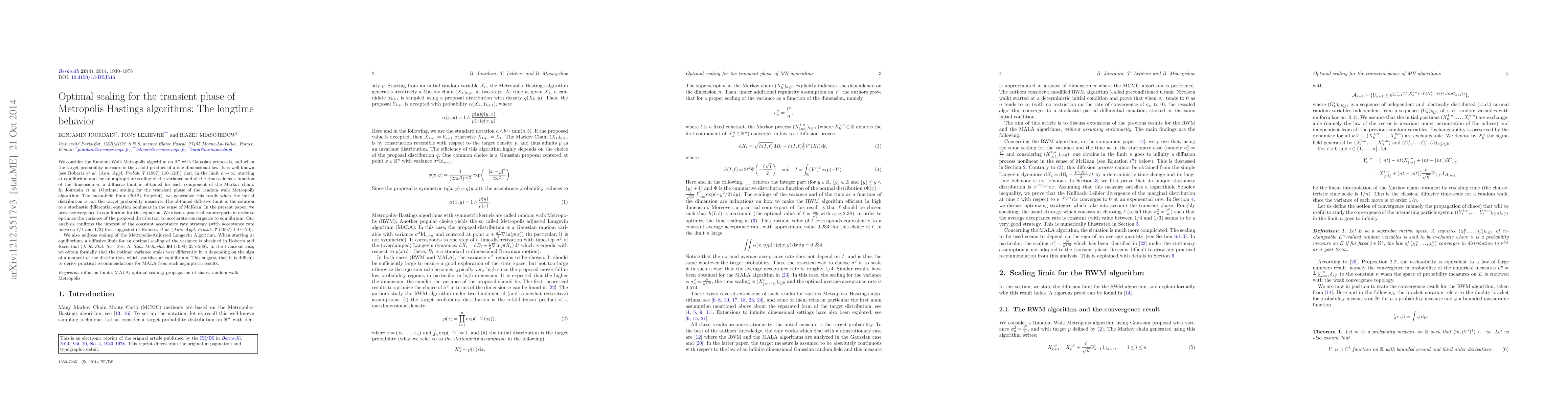 We consider the Random Walk Metropolis algorithm on $\mathbb{R}^n$ with Gaussian proposals, and when the target probability measure is the $n$-fold product of a one-dimensional law. It is well known (see Roberts et al. (Ann. Appl. Probab. 7 (1997) 110-120)) that, in the limit $n\to\infty$, starting at equilibrium and for an appropriate scaling of the variance and of the timescale as a function of the dimension $n$, a diffusive limit is obtained for each component of the Markov chain. In Jourdain et al. (Optimal scaling for the transient phase of the random walk Metropolis algorithm: The mean-field limit (2012) Preprint), we generalize this result when the initial distribution is not the target probability measure. The obtained diffusive limit is the solution to a stochastic differential equation nonlinear in the sense of McKean. In the present paper, we prove convergence to equilibrium for this equation. We discuss practical counterparts in order to optimize the variance of the proposal distribution to accelerate convergence to equilibrium. Our analysis confirms the interest of the constant acceptance rate strategy (with acceptance rate between $1/4$ and $1/3$) first suggested in Roberts et al. (Ann. Appl. Probab. 7 (1997) 110-120). We also address scaling of the Metropolis-Adjusted Langevin Algorithm. When starting at equilibrium, a diffusive limit for an optimal scaling of the variance is obtained in Roberts and Rosenthal (J. R. Stat. Soc. Ser. B. Stat. Methodol. 60 (1998) 255-268). In the transient case, we obtain formally that the optimal variance scales very differently in $n$ depending on the sign of a moment of the distribution, which vanishes at equilibrium. This suggest that it is difficult to derive practical recommendations for MALA from such asymptotic results.
