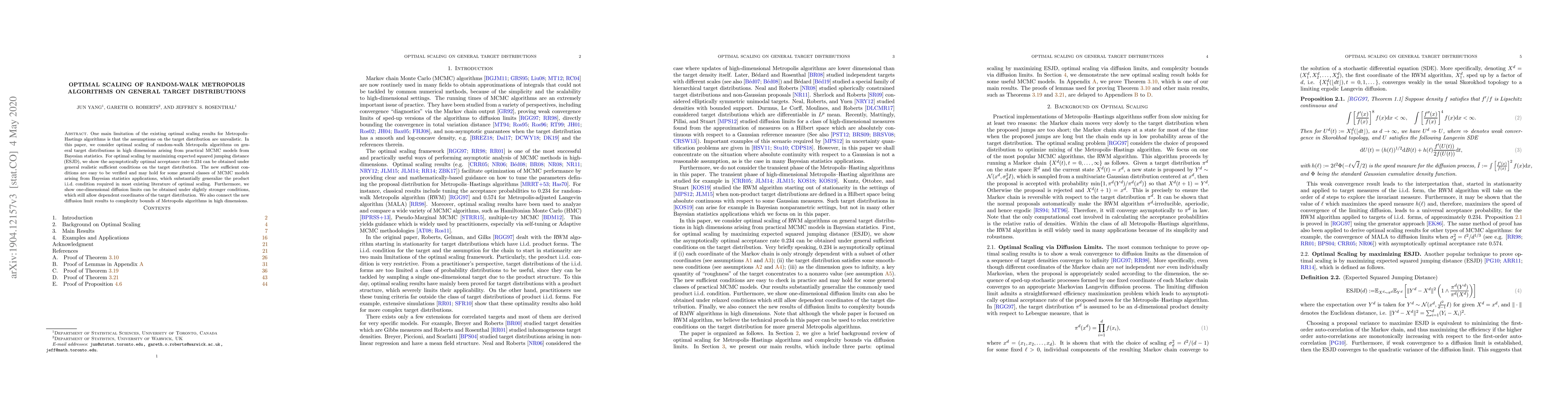 This paper addresses the optimal scaling of random-walk Metropolis algorithms for general target distributions in high dimensions, showing that an asymptotically optimal acceptance rate of $0.234$ can be achieved under realistic conditions. It generalizes existing assumptions and connects new diffusion limit results to the complexity of high-dimensional Metropolis algorithms.