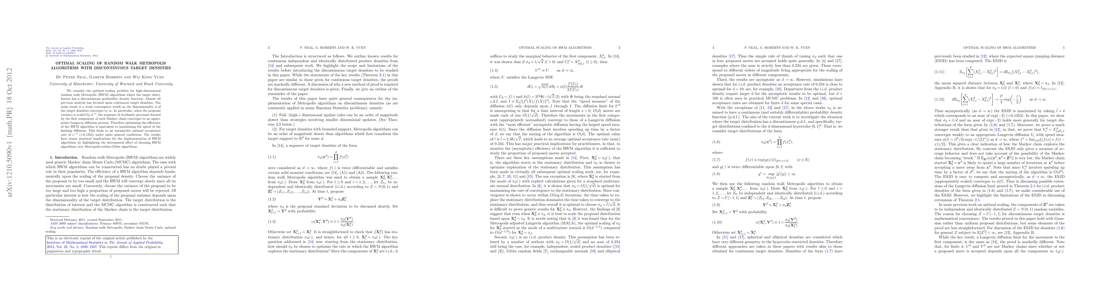 We consider the optimal scaling problem for high-dimensional random walk Metropolis (RWM) algorithms where the target distribution has a discontinuous probability density function. Almost all previous analysis has focused upon continuous target densities. The main result is a weak convergence result as the dimensionality d of the target densities converges to infinity. In particular, when the proposal variance is scaled by $d^{-2}$, the sequence of stochastic processes formed by the first component of each Markov chain converges to an appropriate Langevin diffusion process. Therefore optimizing the efficiency of the RWM algorithm is equivalent to maximizing the speed of the limiting diffusion. This leads to an asymptotic optimal acceptance rate of $e^{-2}$ (=0.1353) under quite general conditions. The results have major practical implications for the implementation of RWM algorithms by highlighting the detrimental effect of choosing RWM algorithms over Metropolis-within-Gibbs algorithms.