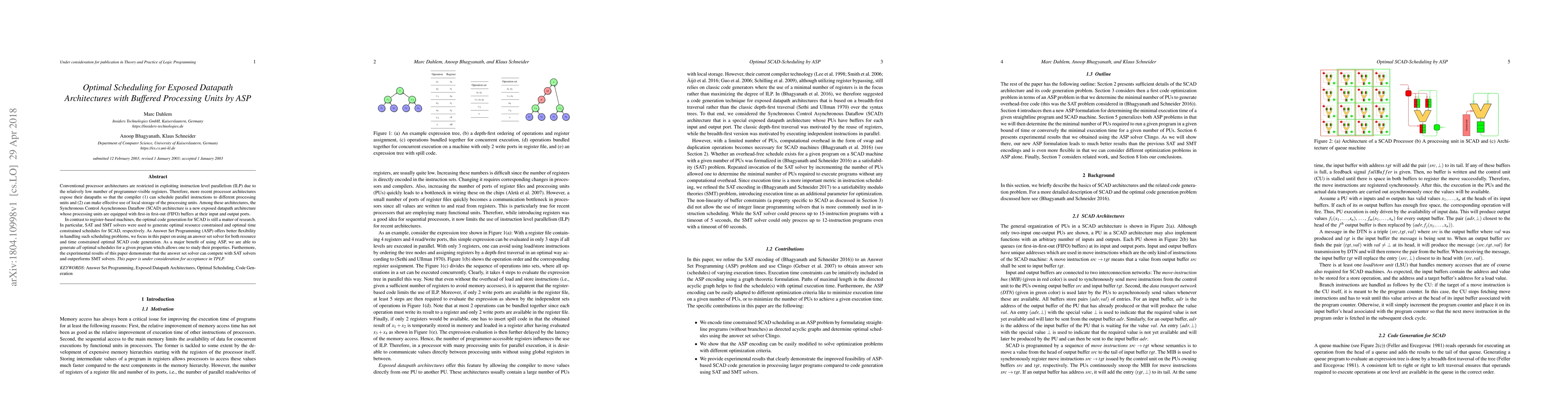 This paper explores optimal scheduling for the Synchronous Control Asynchronous Dataflow (SCAD) architecture using Answer Set Programming (ASP). It demonstrates that ASP can generate all optimal schedules for resource and time constraints, outperforming SAT and SMT solvers, and is under consideration for publication in TPLP.