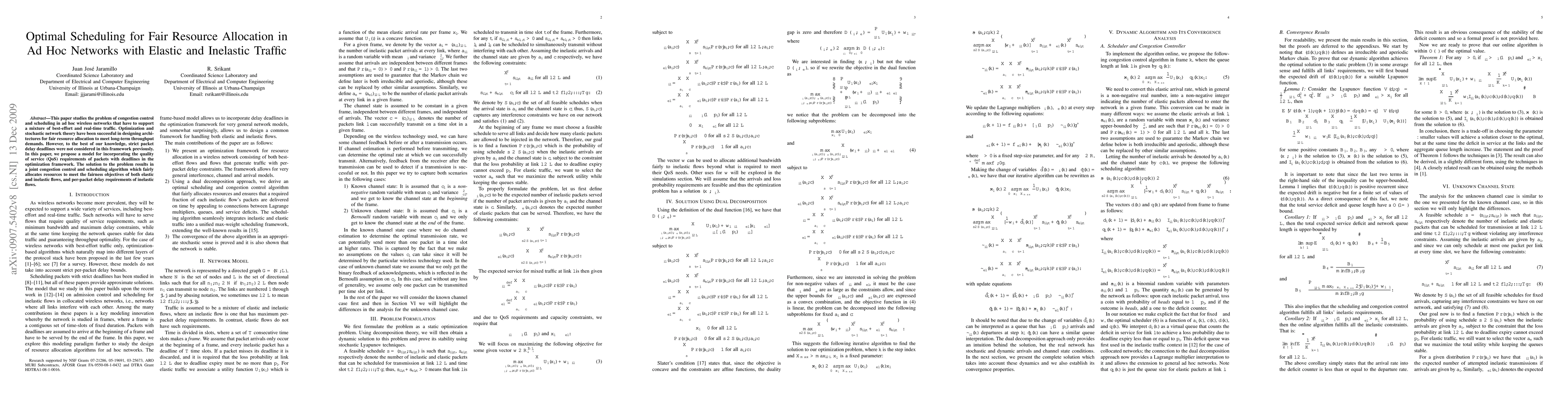 This paper proposes a model to optimize congestion control and scheduling in ad hoc networks, incorporating QoS requirements for packets with strict delay deadlines. The developed algorithm achieves fair resource allocation for both elastic and inelastic traffic flows while meeting per-packet delay constraints.