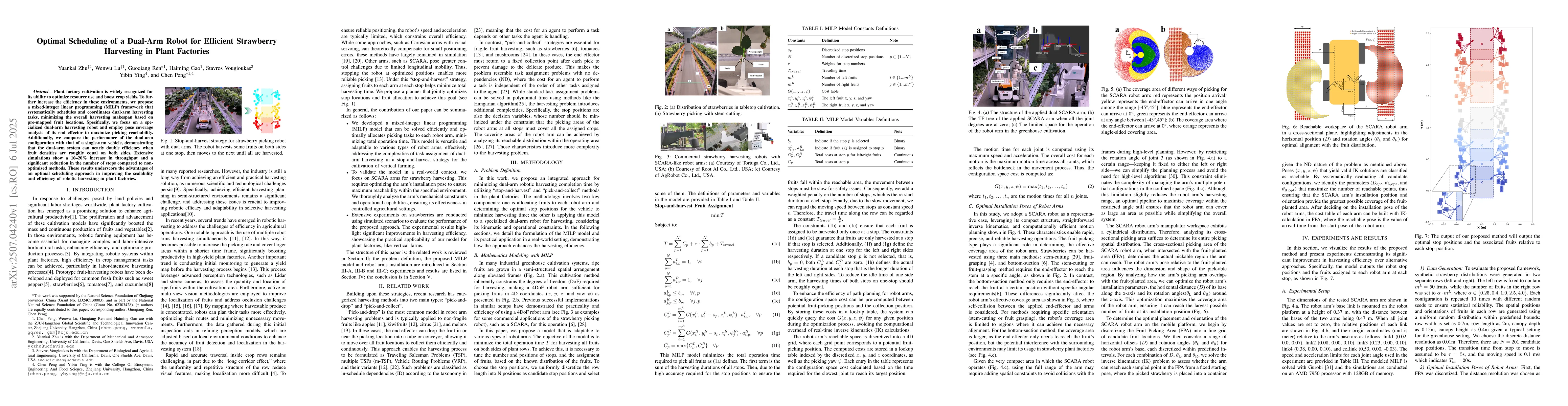 Plant factory cultivation is widely recognized for its ability to optimize resource use and boost crop yields. To further increase the efficiency in these environments, we propose a mixed-integer linear programming (MILP) framework that systematically schedules and coordinates dual-arm harvesting tasks, minimizing the overall harvesting makespan based on pre-mapped fruit locations. Specifically, we focus on a specialized dual-arm harvesting robot and employ pose coverage analysis of its end effector to maximize picking reachability. Additionally, we compare the performance of the dual-arm configuration with that of a single-arm vehicle, demonstrating that the dual-arm system can nearly double efficiency when fruit densities are roughly equal on both sides. Extensive simulations show a 10-20% increase in throughput and a significant reduction in the number of stops compared to non-optimized methods. These results underscore the advantages of an optimal scheduling approach in improving the scalability and efficiency of robotic harvesting in plant factories.