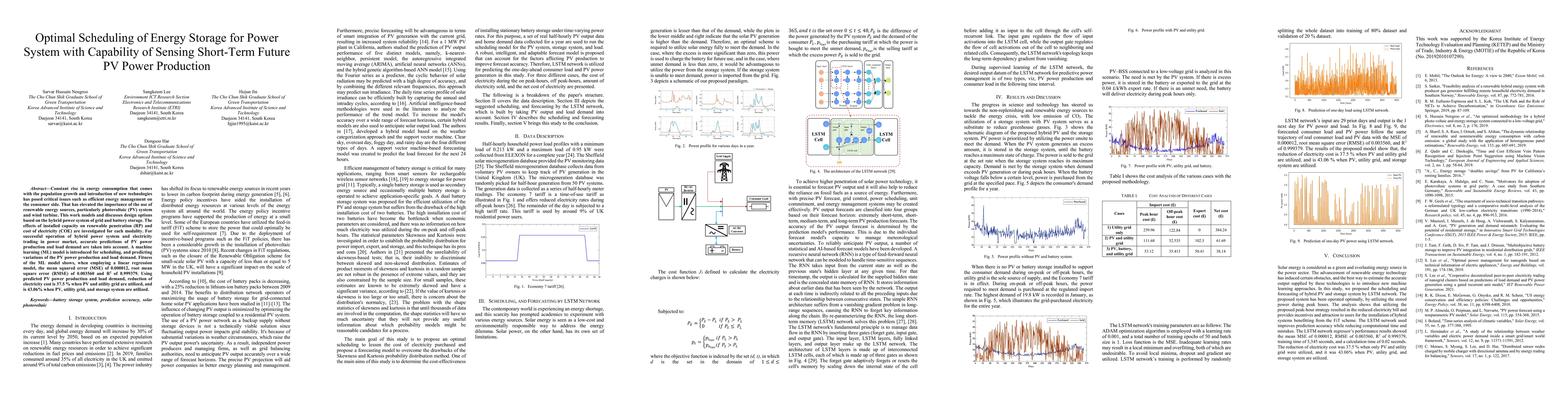This paper investigates optimal scheduling of energy storage in a hybrid power system incorporating renewable PV power and grid resources, using a machine learning model to predict PV production and load demand. The study finds that integrating storage can reduce electricity costs by 43.06%, compared to a 37.5% reduction when only PV and grid are used.
