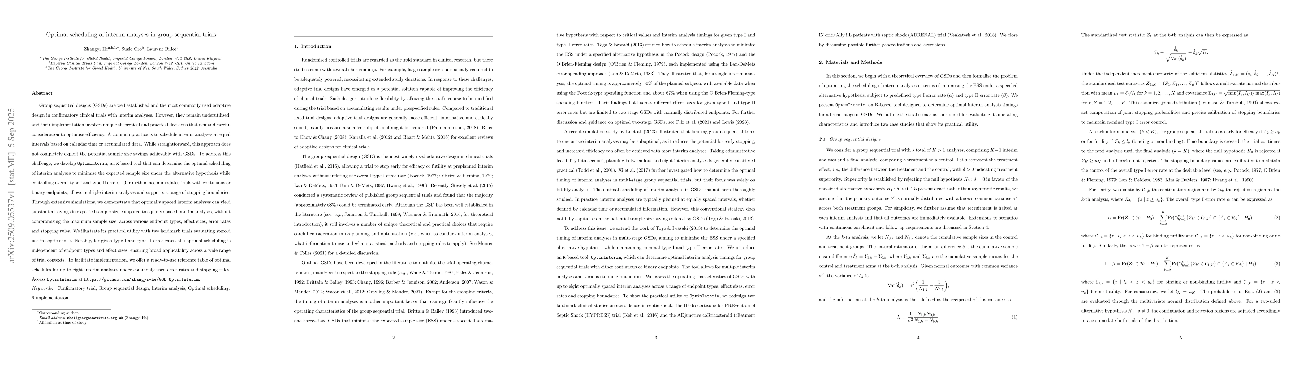 Group sequential designs (GSDs) are well established and the most commonly used adaptive design in confirmatory clinical trials with interim analyses. However, they remain underutilised, and their implementation involves unique theoretical and practical decisions that demand careful consideration to optimise efficiency. A common practice is to schedule interim analyses at equal intervals based on calendar time or accumulated data. While straightforward, this approach does not completely exploit the potential sample size savings achievable with GSDs. To address this challenge, we develop OptimInterim, an R-based tool that can determine the optimal scheduling of interim analyses to minimise the expected sample size under the alternative hypothesis while controlling overall type I and type II errors. Our method accommodates trials with continuous or binary endpoints, allows multiple interim analyses and supports a range of stopping boundaries. Through extensive simulations, we demonstrate that optimally spaced interim analyses can yield substantial savings in expected sample size compared to equally spaced interim analyses, without compromising the maximum sample size, across various endpoint types, effect sizes, error rates and stopping rules. We illustrate its practical utility with two landmark trials evaluating steroid use in septic shock. Notably, for given type I and type II error rates, the optimal scheduling is independent of endpoint types and effect sizes, ensuring broad applicability across a wide range of trial contexts. To facilitate implementation, we offer a ready-to-use reference table of optimal schedules for up to eight interim analyses under commonly used error rates and stopping rules. Access OptimInterim at https://github.com/zhangyi-he/GSD_OptimInterim.