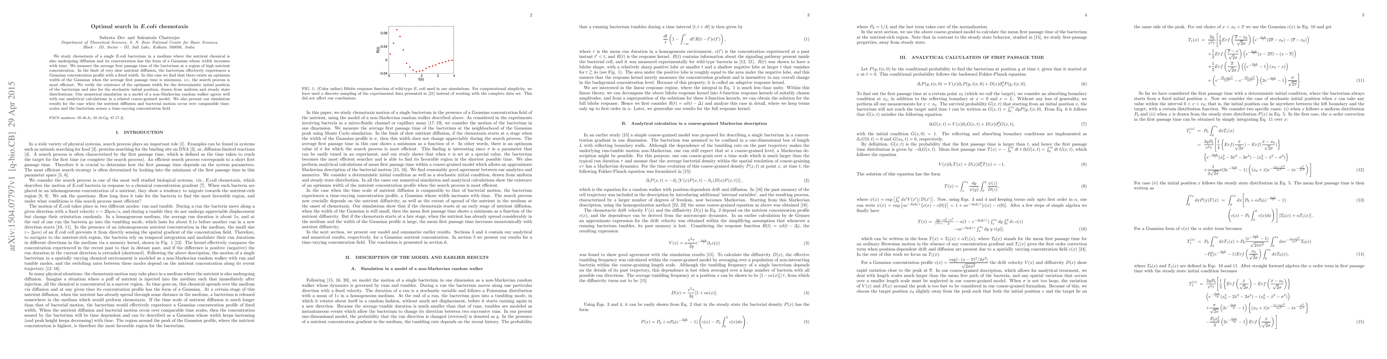 E.coli bacteria exhibit optimal search behavior in a medium with varying nutrient concentration, which is most efficient when the concentration profile has a specific width. This finding applies to both deterministic and stochastic initial positions.