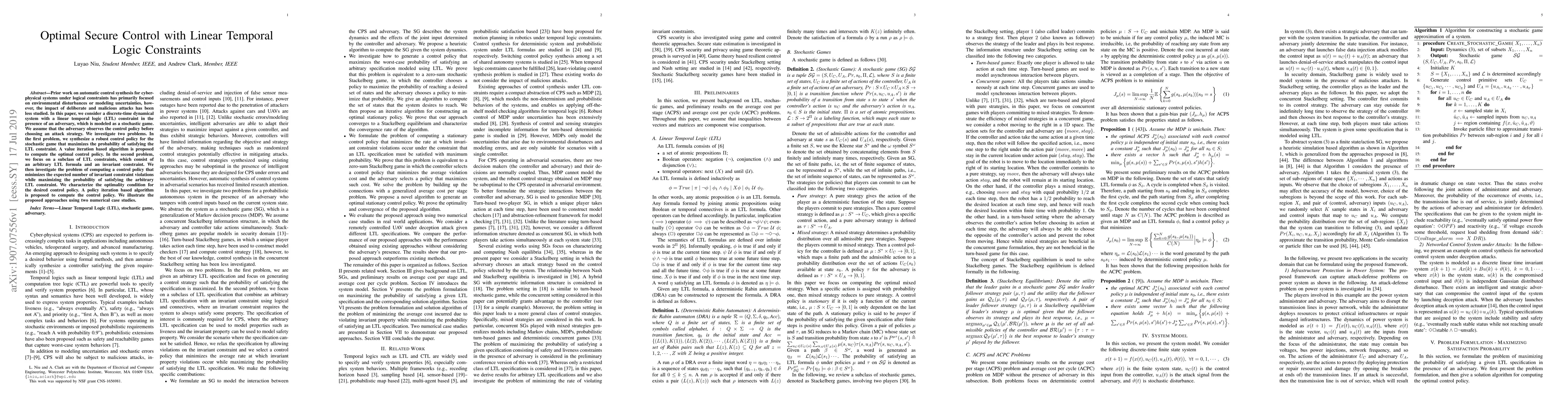 This research develops methods to design control policies for systems under attack, ensuring safety via Linear Temporal Logic (LTL) constraints. It proposes value iteration and policy iteration algorithms for maximizing LTL satisfaction probability and minimizing invariant constraint violations, respectively. Numerical examples demonstrate these approaches.