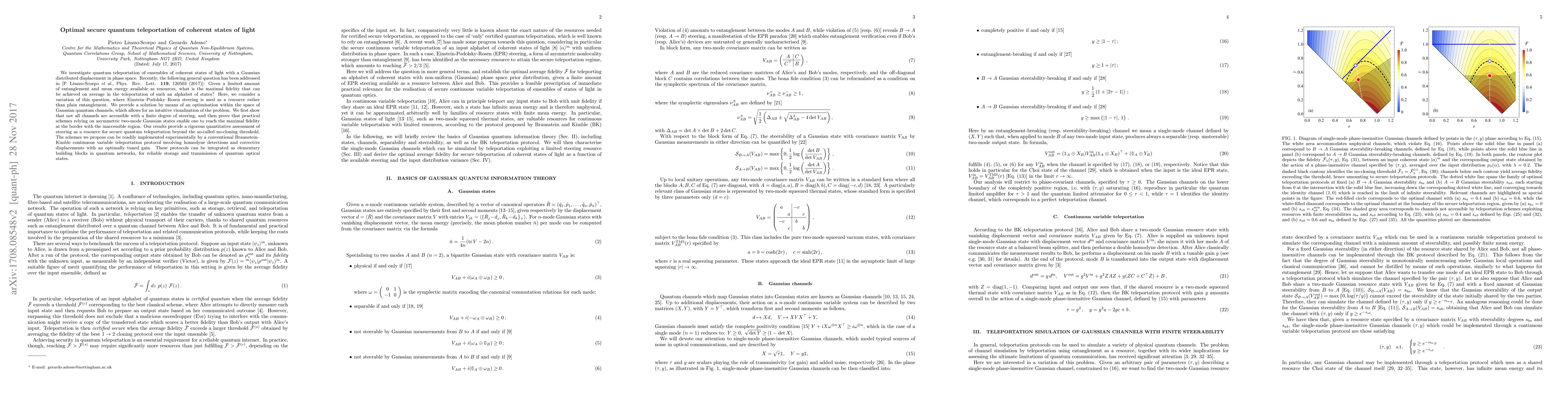 The research investigates optimal secure quantum teleportation of coherent states of light using Gaussian distributed displacement in phase space, employing Einstein-Podolsky-Rosen (EPR) steering as a resource instead of entanglement. It optimizes within the space of Gaussian quantum channels, providing an intuitive visualization of the problem.