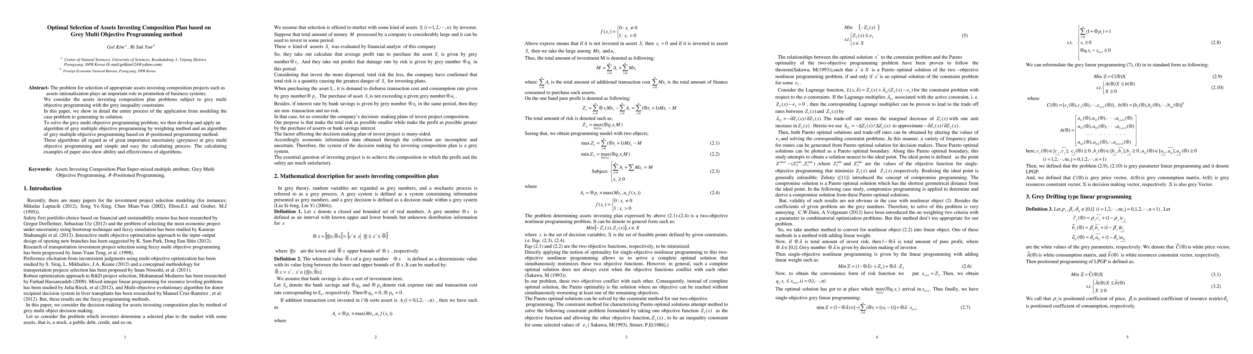 This paper proposes a grey multi-objective programming approach for optimal asset selection in investment composition plans, addressing uncertainty through greyness. It develops two algorithms—one based on weighting and another on q-positioned programming—to effectively solve the problem, demonstrating their effectiveness through computational examples.