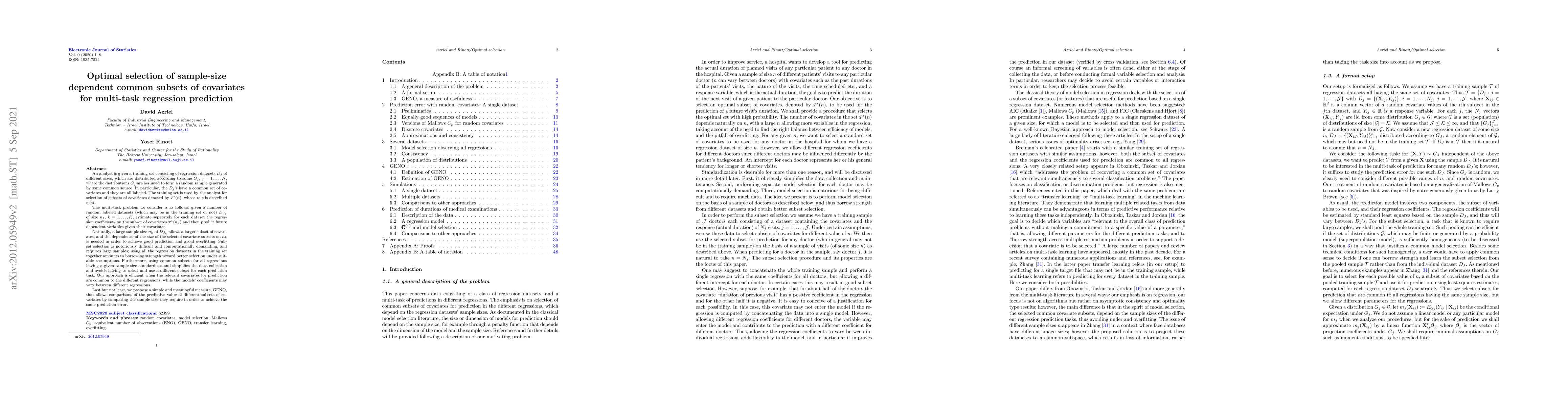 An analyst is given a training set consisting of regression datasets $D_j$ of different sizes, which are distributed according to some $G_j$, $j=1,\ldots,\cal J$, where the distributions $G_j$ are assumed to form a random sample generated by some common source. In particular, the $D_j$'s have a common set of covariates and they are all labeled. The training set is used by the analyst for selection of subsets of covariates denoted by ${P}^*(n)$, whose role is described next. The multi-task problem we consider is as follows: given a number of random labeled datasets (which may be in the training set or not) $D_{J_k}$ of size $n_k$, $k=1,\ldots,K$, estimate separately for each dataset the regression coefficients on the subset of covariates ${P}^*(n_k)$ and then predict future dependent variables given their covariates. Naturally, a large sample size $n_k$ of $D_{J_k}$ allows a larger subset of covariates, and the dependence of the size of the selected covariate subsets on $n_k$ is needed in order to achieve good prediction and avoid overfitting. Subset selection is notoriously difficult and computationally demanding, and requires large samples; using all the regression datasets in the training set together amounts to borrowing strength toward better selection under suitable assumptions. Furthermore, using common subsets for all regressions having a given sample size standardizes and simplifies the data collection and avoids having to select and use a different subset for each prediction task. Our approach is efficient when the relevant covariates for prediction are common to the different regressions, while the models' coefficients may vary between different regressions.