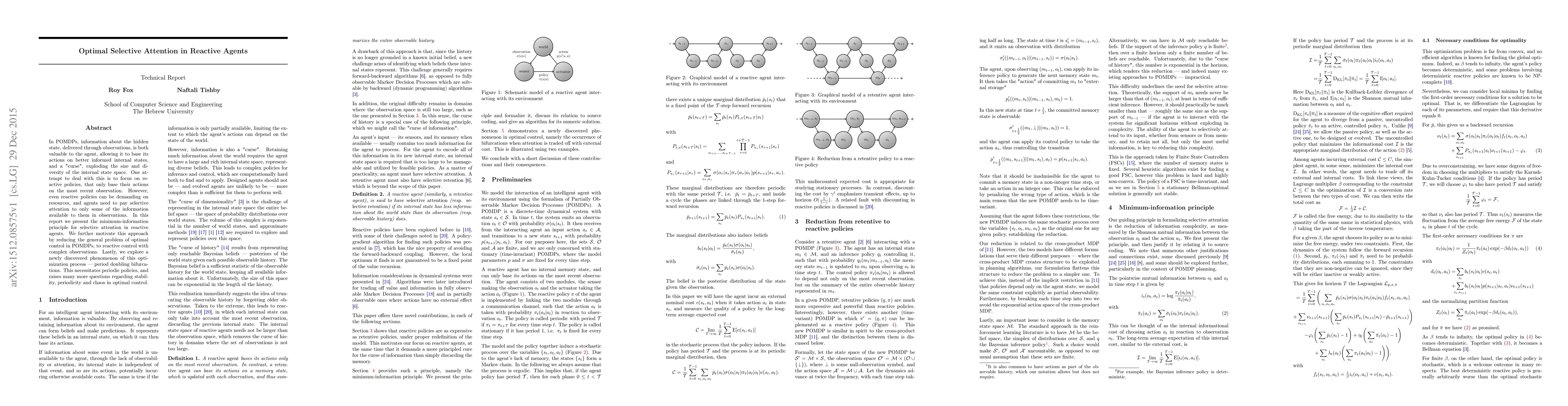 In POMDPs, information about the hidden state, delivered through observations, is both valuable to the agent, allowing it to base its actions on better informed internal states, and a "curse", exploding the size and diversity of the internal state space. One attempt to deal with this is to focus on reactive policies, that only base their actions on the most recent observation. However, even reactive policies can be demanding on resources, and agents need to pay selective attention to only some of the information available to them in observations. In this report we present the minimum-information principle for selective attention in reactive agents. We further motivate this approach by reducing the general problem of optimal control in POMDPs, to reactive control with complex observations. Lastly, we explore a newly discovered phenomenon of this optimization process - period doubling bifurcations. This necessitates periodic policies, and raises many more questions regarding stability, periodicity and chaos in optimal control.