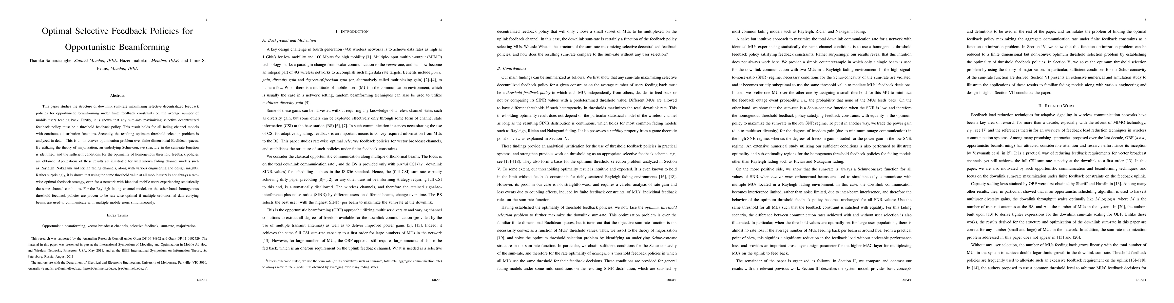 This paper studies the structure of downlink sum-rate maximizing selective decentralized feedback policies for opportunistic beamforming under finite feedback constraints on the average number of mobile users feeding back. Firstly, it is shown that any sum-rate maximizing selective decentralized feedback policy must be a threshold feedback policy. This result holds for all fading channel models with continuous distribution functions. Secondly, the resulting optimum threshold selection problem is analyzed in detail. This is a non-convex optimization problem over finite dimensional Euclidean spaces. By utilizing the theory of majorization, an underlying Schur-concave structure in the sum-rate function is identified, and the sufficient conditions for the optimality of homogenous threshold feedback policies are obtained. Applications of these results are illustrated for well known fading channel models such as Rayleigh, Nakagami and Rician fading channels, along with various engineering and design insights. Rather surprisingly, it is shown that using the same threshold value at all mobile users is not always a rate-wise optimal feedback strategy, even for a network with identical mobile users experiencing statistically the same channel conditions. For the Rayleigh fading channel model, on the other hand, homogenous threshold feedback policies are proven to be rate-wise optimal if multiple orthonormal data carrying beams are used to communicate with multiple mobile users simultaneously.