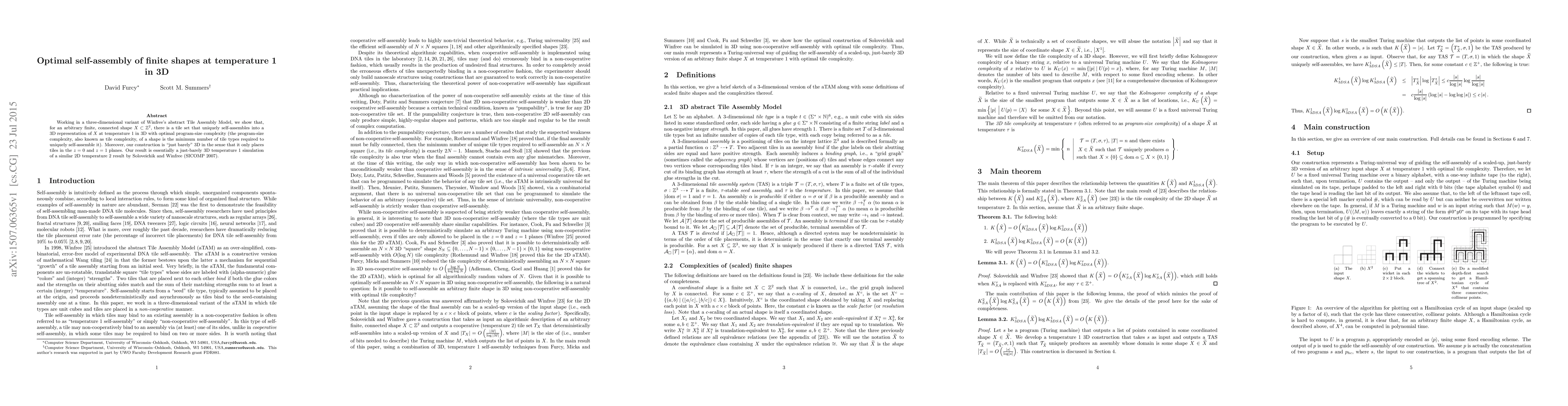 Working in a three-dimensional variant of Winfree's abstract Tile Assembly Model, we show that, for an arbitrary finite, connected shape $X \subset \mathbb{Z}^2$, there is a tile set that uniquely self-assembles into a 3D representation of a scaled-up version of $X$ at temperature 1 in 3D with optimal program-size complexity (the "program-size complexity", also known as "tile complexity", of a shape is the minimum number of tile types required to uniquely self-assemble it). Moreover, our construction is "just barely" 3D in the sense that it only places tiles in the $z = 0$ and $z = 1$ planes. Our result is essentially a just-barely 3D temperature 1 simulation of a similar 2D temperature 2 result by Soloveichik and Winfree (SICOMP 2007).