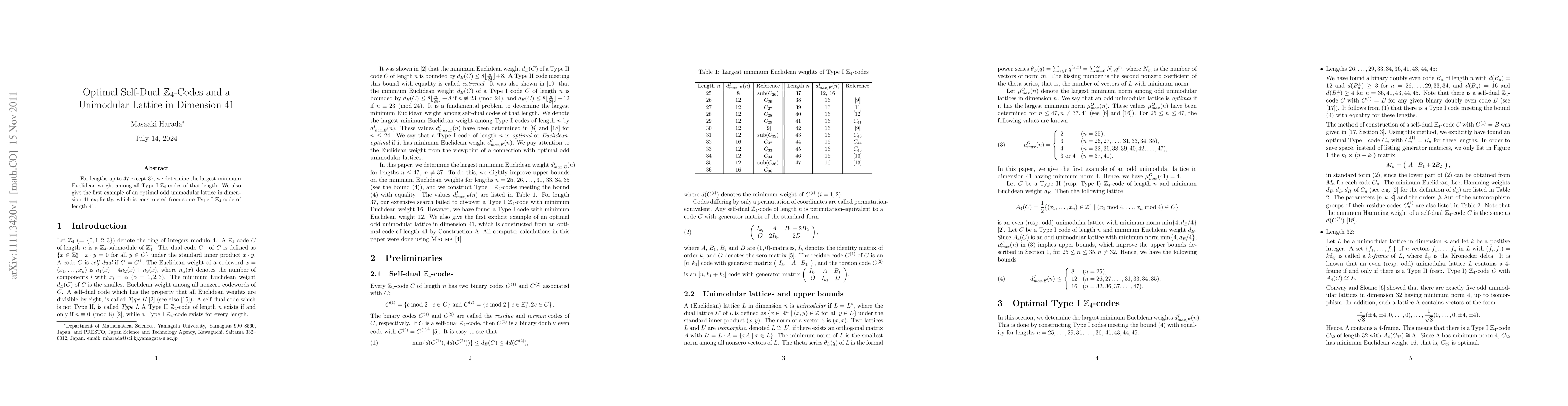 This paper identifies the largest minimum Euclidean weight for Type I Z4-codes up to length 47, excluding 37, and presents the first explicit example of an optimal odd unimodular lattice in dimension 41 derived from a Type I Z4-code of length 41.